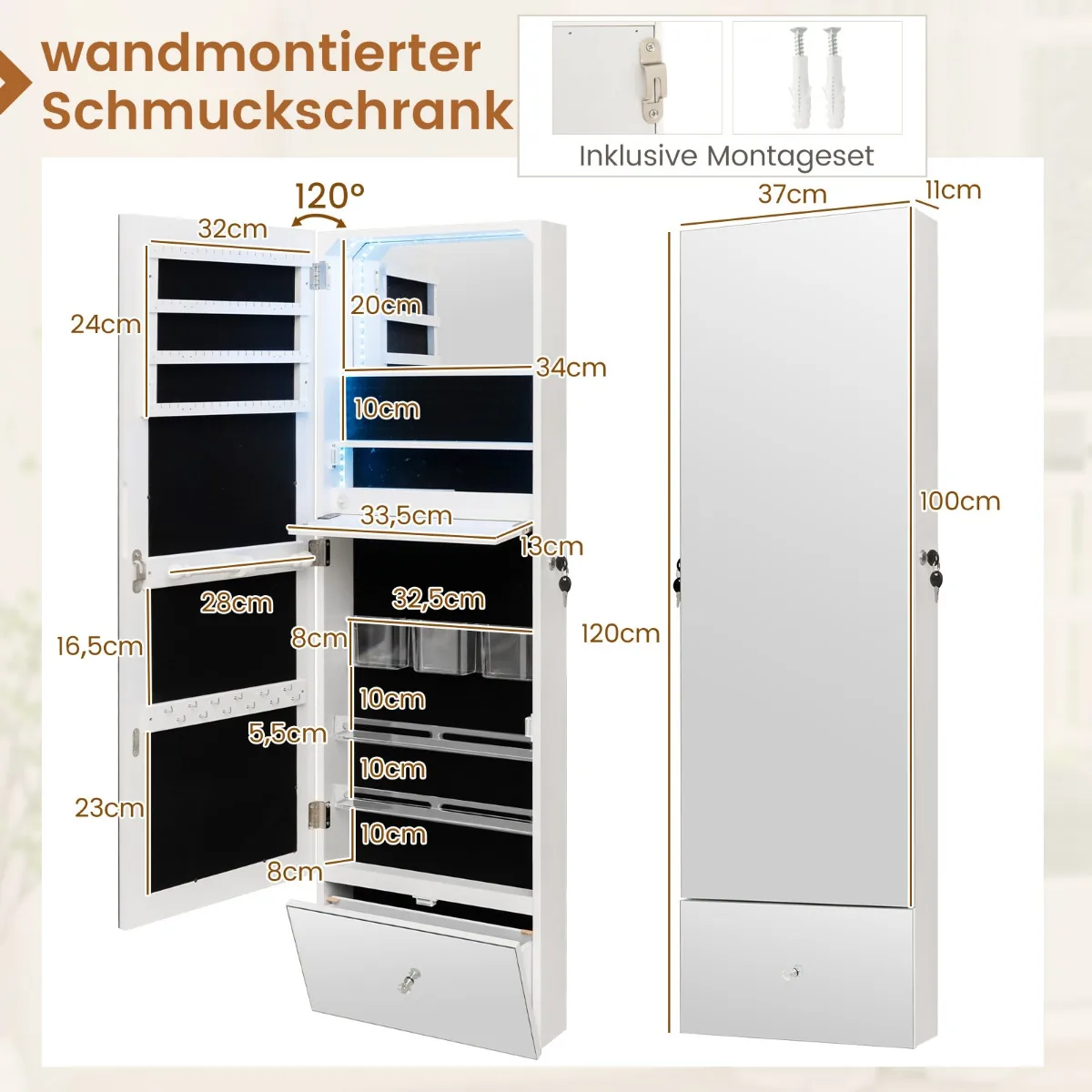 Pakabinamas veidrodis-papuošalų spintelė 120x37x11cm, baltos ir juodos spalvos, yra praktiškas sprendimas papuošalų laikymui mažose erdvėse. Ši spintelė derina funkcionalumą su integruotu LED apšviestu veidrodžiu ir suteikia saugią vietą karoliams, žiedams, auskarams bei kitoms smulkmenoms.