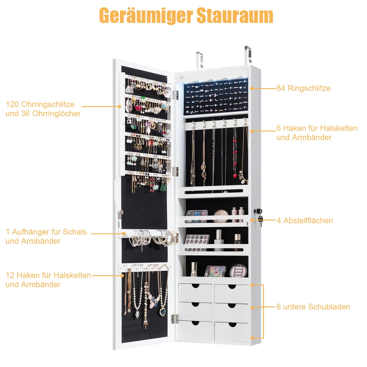 - 4 atviri skyriai ir pakabinamas strypas suteikia papildomą vietą grandinėlėms ir apyrankėms.