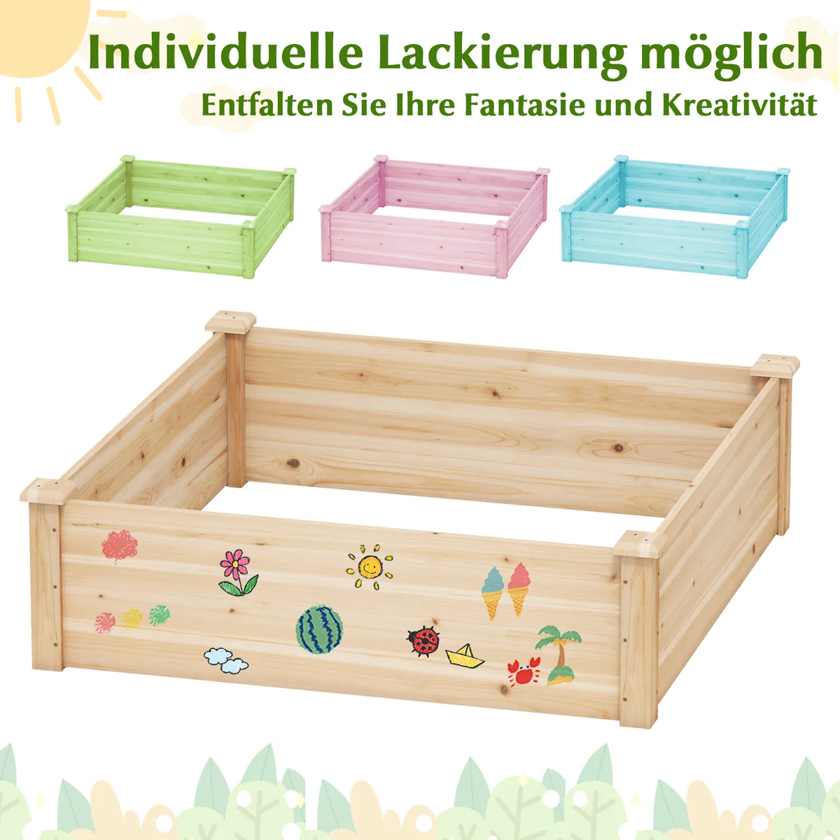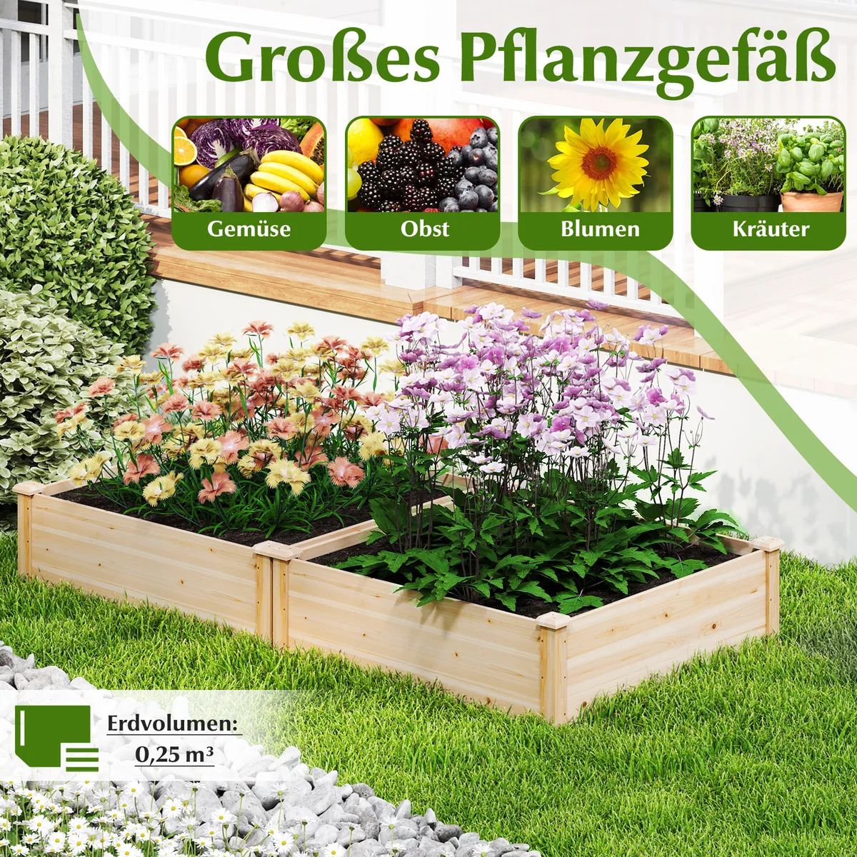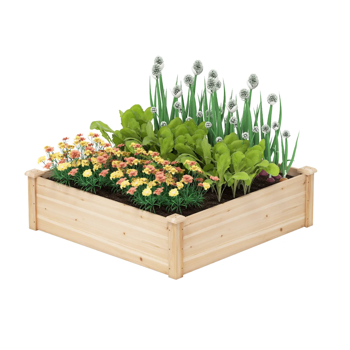 - Medinė pakelta lysvė suteikia erdvę įvairiems augalams – daržovėms, žolelėms, vaisiams ar gėlėms.