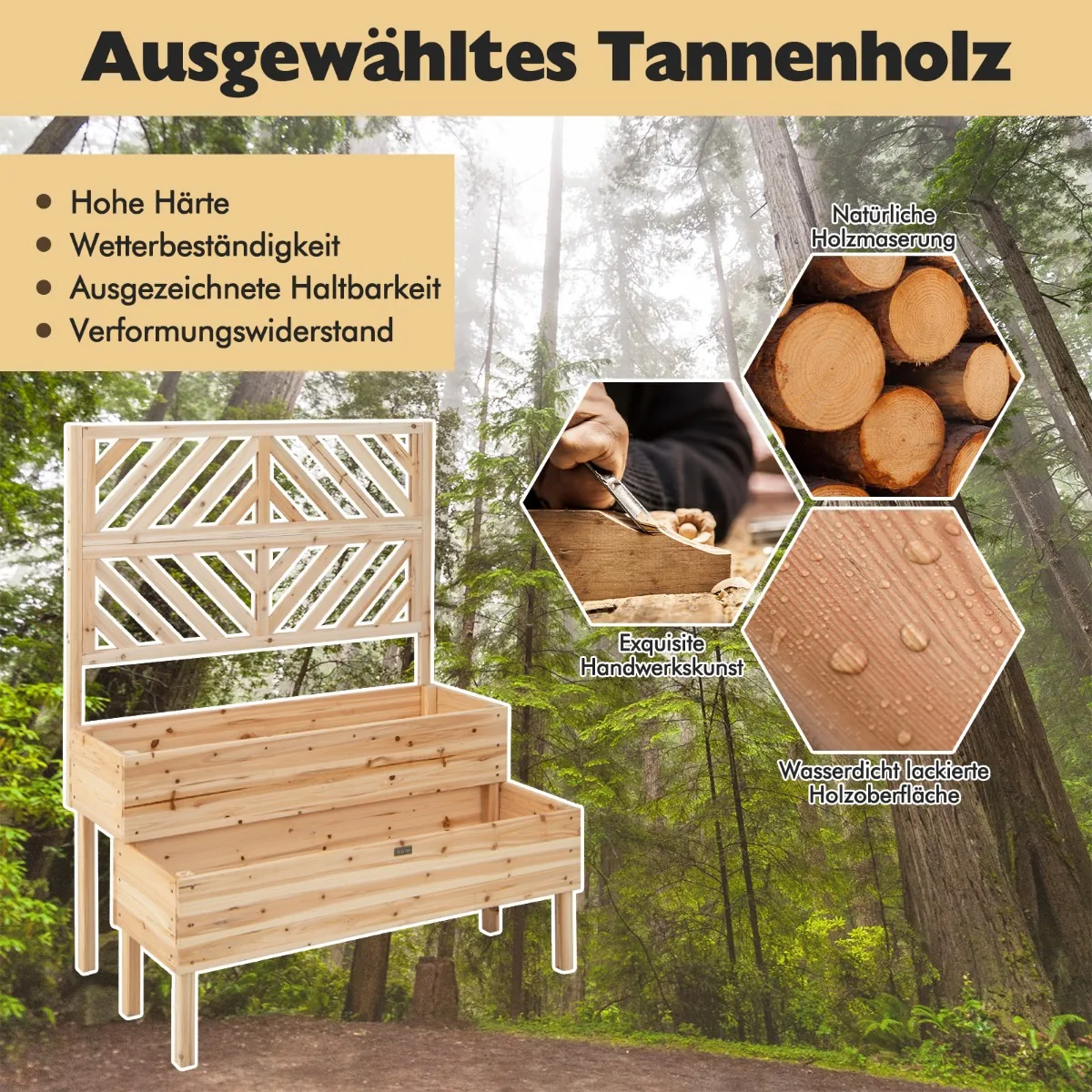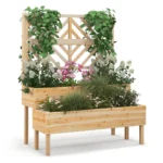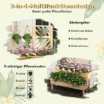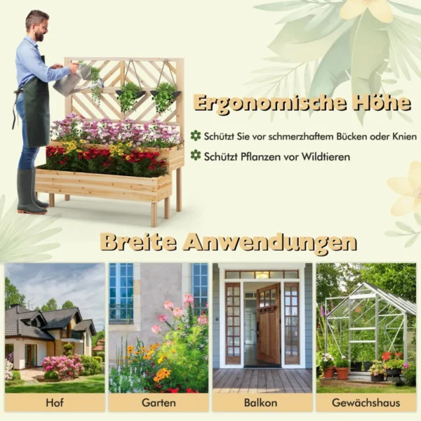Pakelta lysvė 109x62x135cm šviesiai rudos spalvos puikiai tinka įvairių augalų sodinimui tiek lauke, tiek viduje. Natūralios eglės medienos konstrukcija užtikrina atsparumą oro sąlygoms ir ilgaamžiškumą. Dėka dviejų sodinimo dėžių bei grotelių, ši pakelta lysvė suteikia pakankamai vietos vijokliniams augalams, daržovėms, gėlėms ar žolelėms.