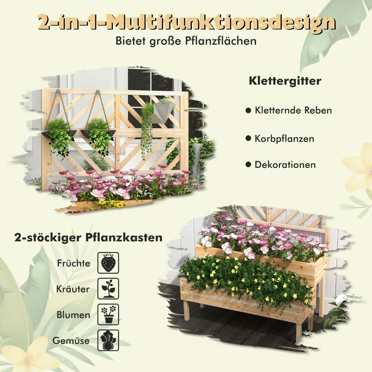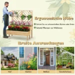 - Dviejų lygių pakelta lysvė su dviem sodinimo dėžėmis (109 x 33 x 20 cm) ir grotelėmis vijokliniams augalams.
