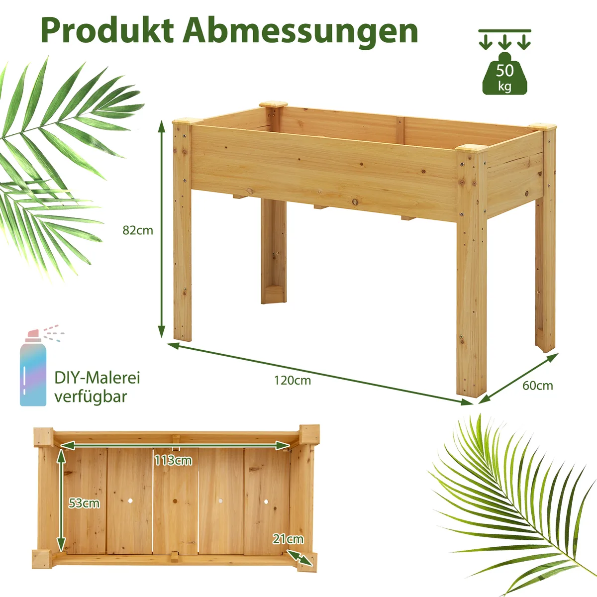 - Vidinis sodinimo plotas: 113 x 53 x 21 cm (P x G x A).