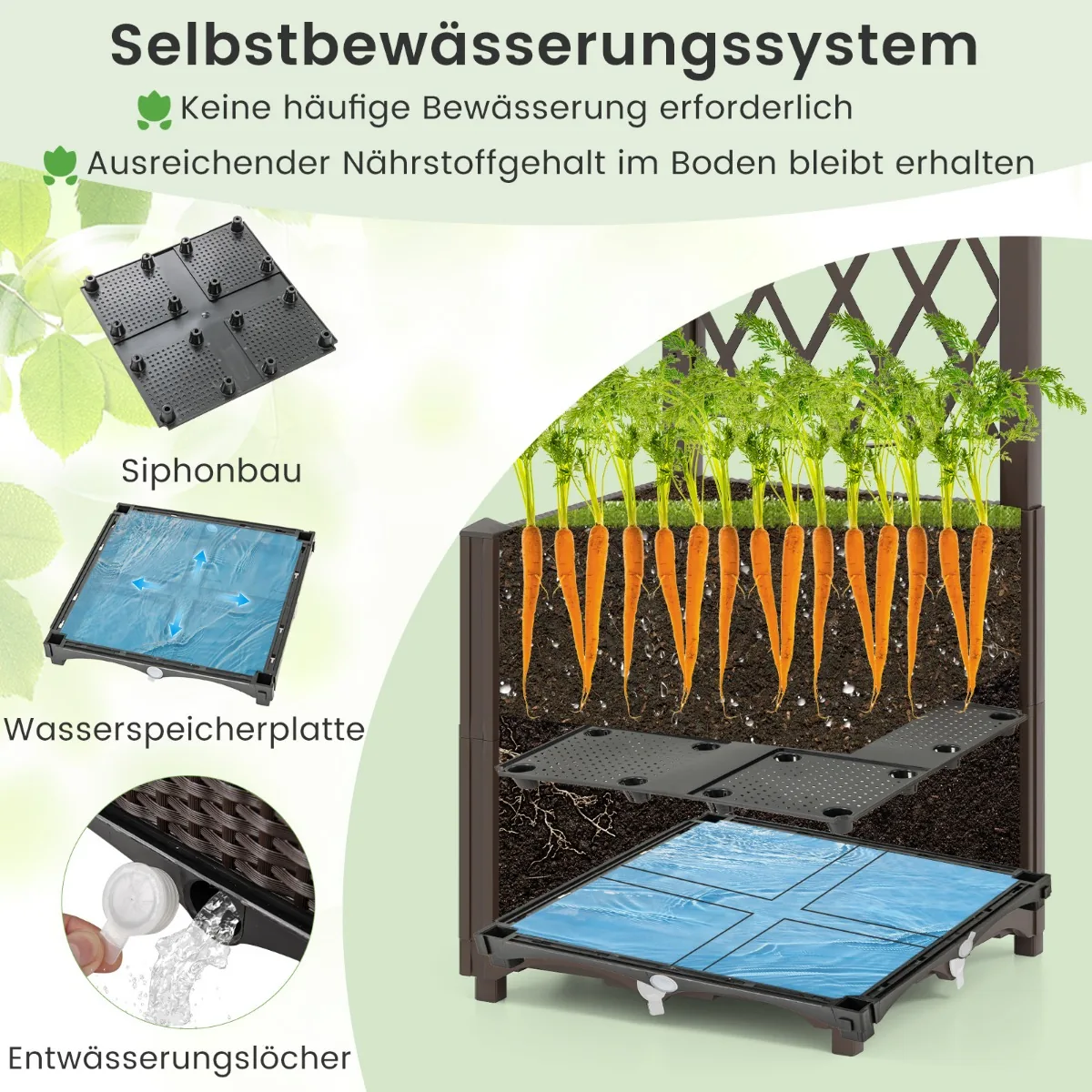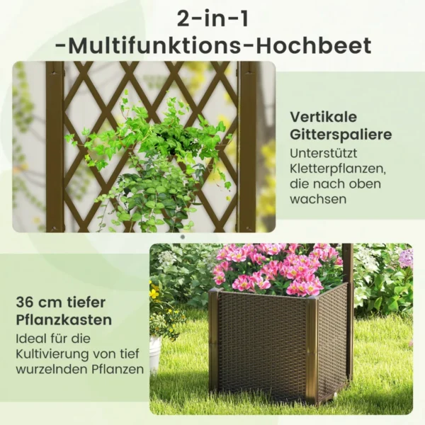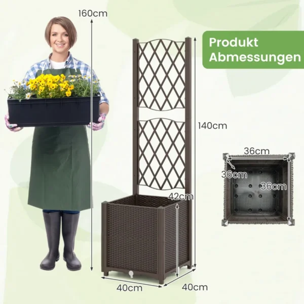 Pakelta lysvė 40x40x140 cm rudos spalvos – funkcionali ir universali sodinimo sistema, skirta daržovėms, gėlėms, vaisiams ir žolelėms auginti. Dėl modulinės konstrukcijos ją galima lengvai sujungti su kitais vienetais, taip išplečiant auginimo plotą. Lysvė turi savaiminio laistymo sistemą ir drenažo angas, kurios užtikrina optimalias vandens sąlygas augalams.
