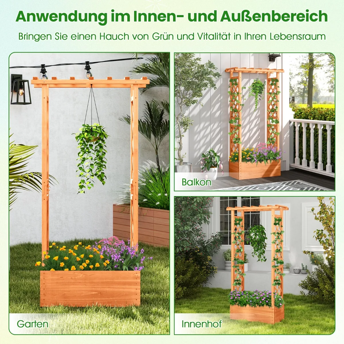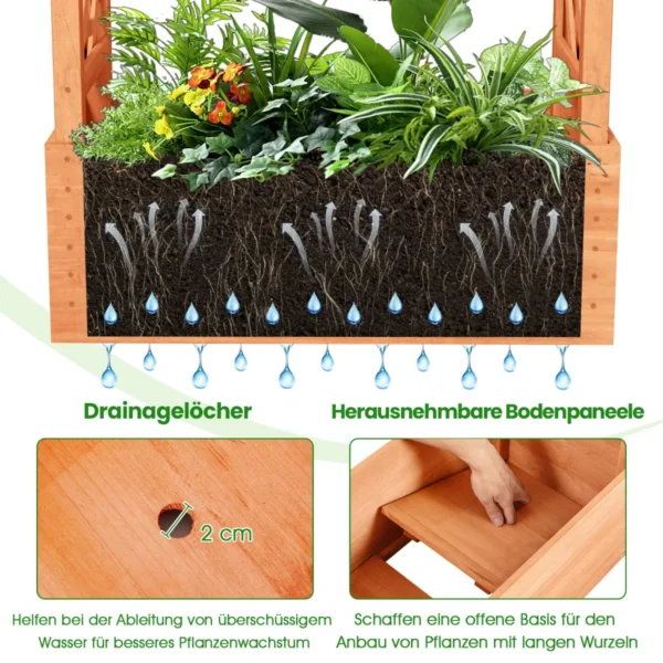 Pakelta lysvė 78x36x152 cm šviesiai rudos spalvos yra praktiškas sprendimas tiek vidaus, tiek lauko sodininkystei. Pagaminta iš natūralios eglės medienos ir padengta vandens pagrindo laku, ši sodinamoji dėžė užtikrina ilgaamžiškumą bei atsparumą įvairioms oro sąlygoms. Lysvės dizainas su grotelėmis leidžia auginti įvairius augalus: vaisius, daržoves, žoleles ir vijoklius, taupant vietą ir suteikiant erdvę kūrybingam sodininkystės išplanavimui.