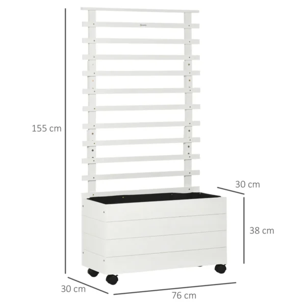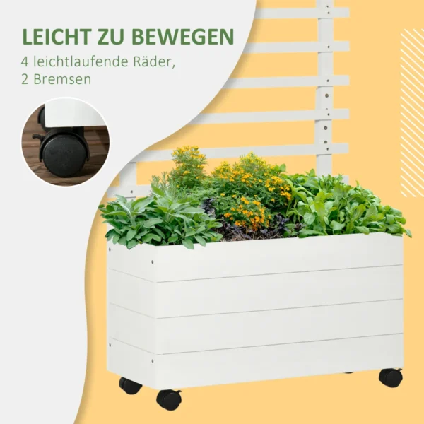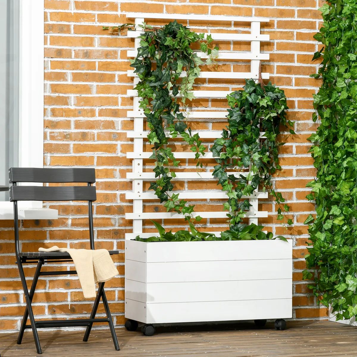 Su šiuo protingu Outsunny žolelių lysvės ir grotelių deriniu galite pasiūlyti savo mėgstamiems augalams dekoratyvius ir originalius namus! Tvirtas grotelės gali būti puiki vieta jūsų vynmedžiams ar dekoratyviniams gėlių krepšiams. 4 sklandžiai veikiantys ratai leidžia be vargo perkelti augalų dėžę ir bet kuriuo metu pritaikyti aplinką pagal savo skonį. Praturtinkite savo namus šiuo rafinuotu, nesenstančiu akį traukiančiu prietaisu!