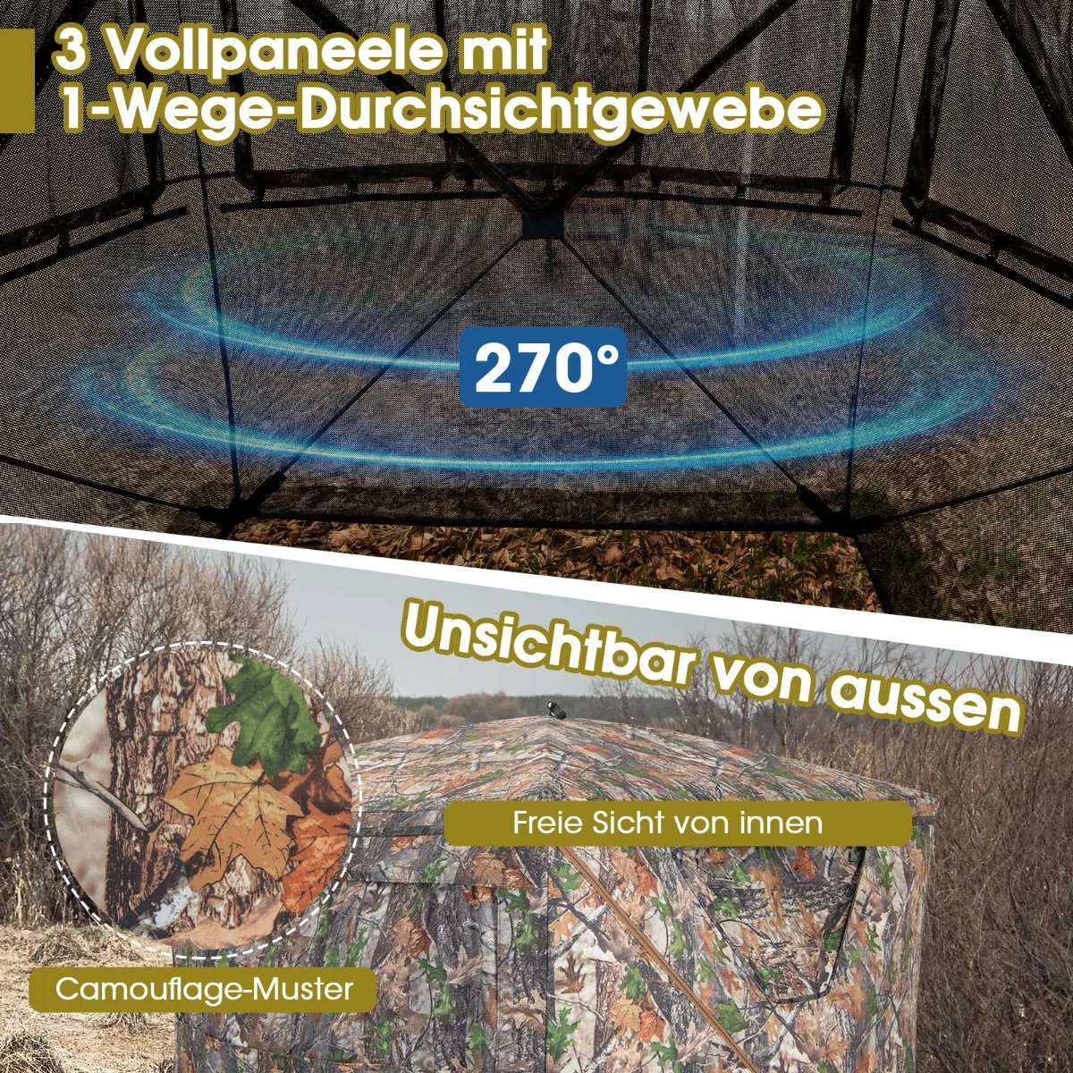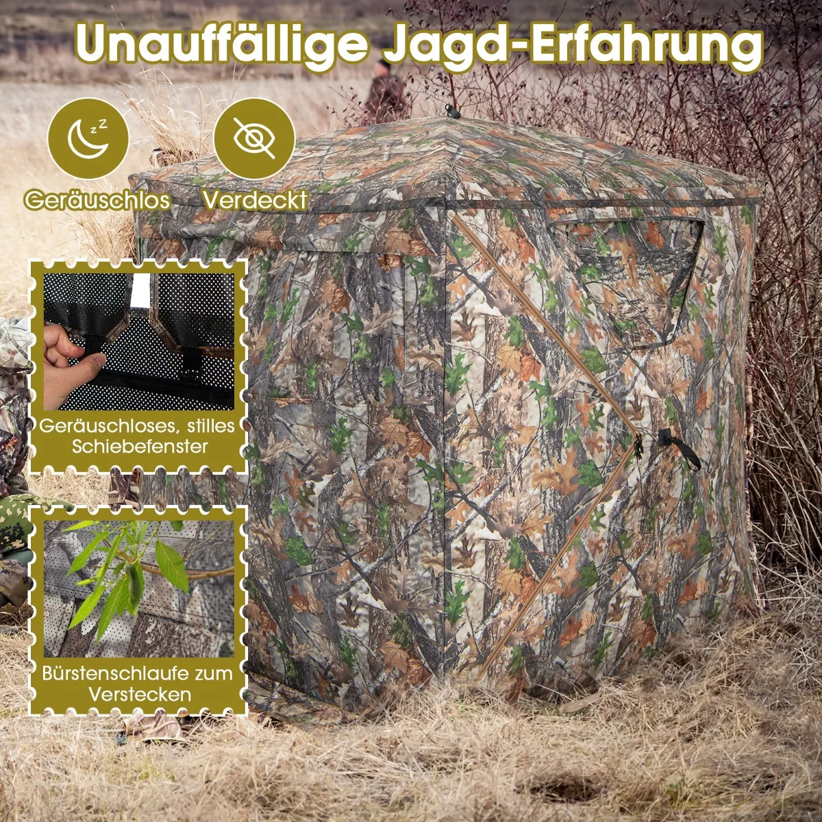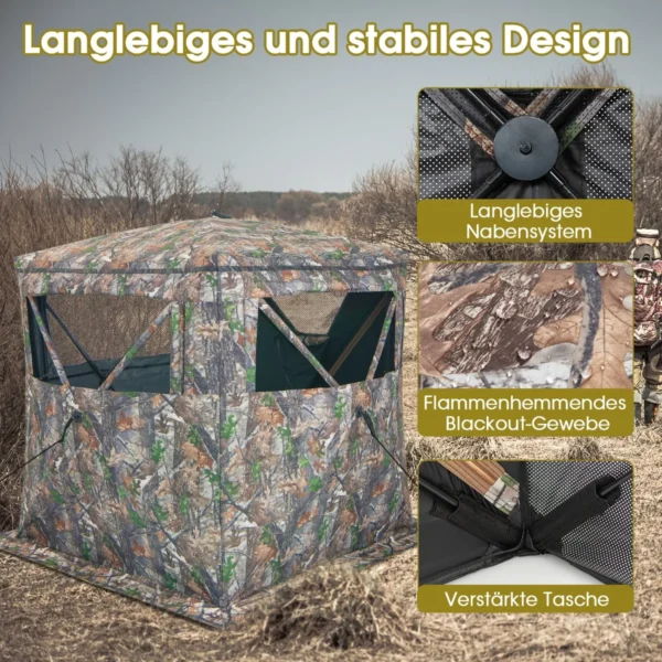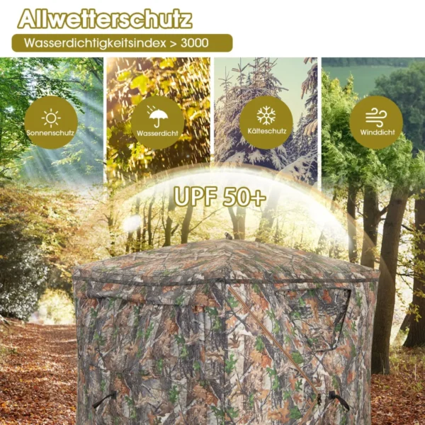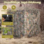 Palapinė 147x147x168cm įvairių spalvų puikiai tinka medžioklei ar lauko veiklai. Kamufliažinis audinys leidžia slėptis gamtoje, o permatomi langai užtikrina patogų matomumą. Palapinė yra lengvai pastatoma ir transportuojama, tinkama naudoti įvairiomis oro sąlygomis.