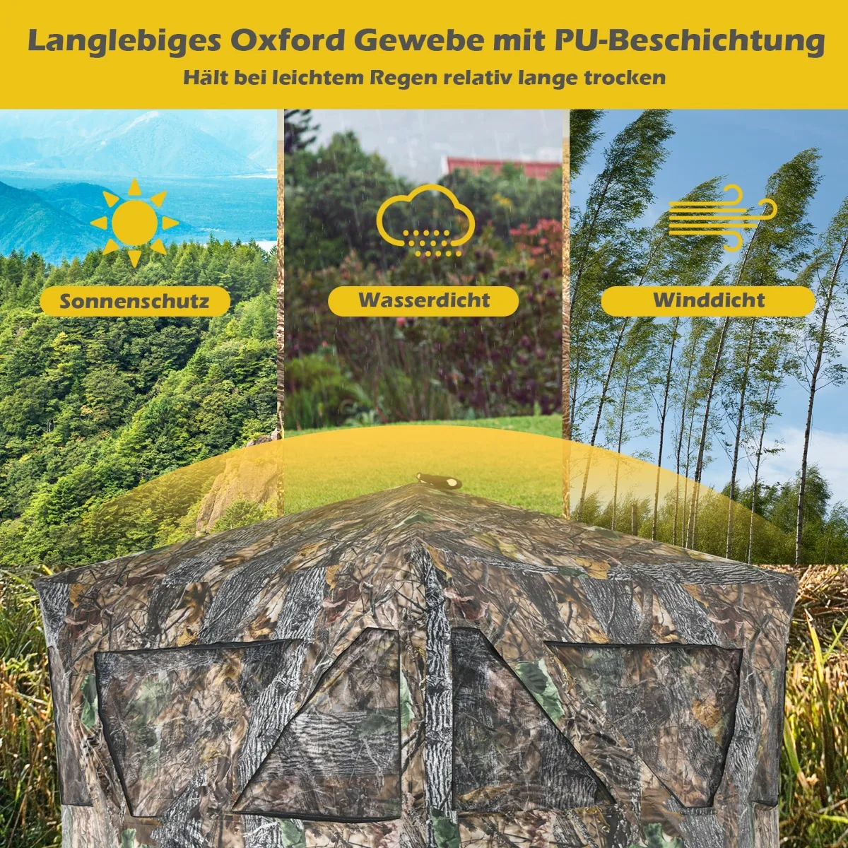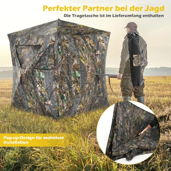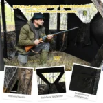 - Medžioklės palapinė su šaudymo prievadais leidžia šaudyti iš įvairių kampų, didinant medžioklės efektyvumą.