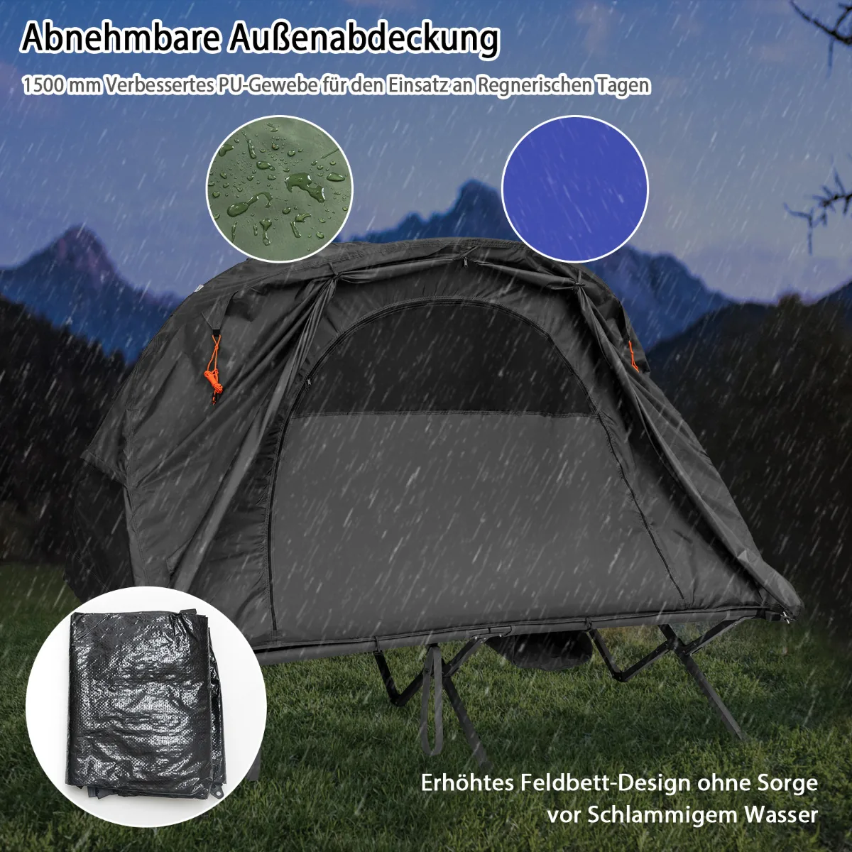- Palapinė pagaminta iš kvėpuojančio vidinio audinio ir vandeniui atsparaus išorinio sluoksnio.