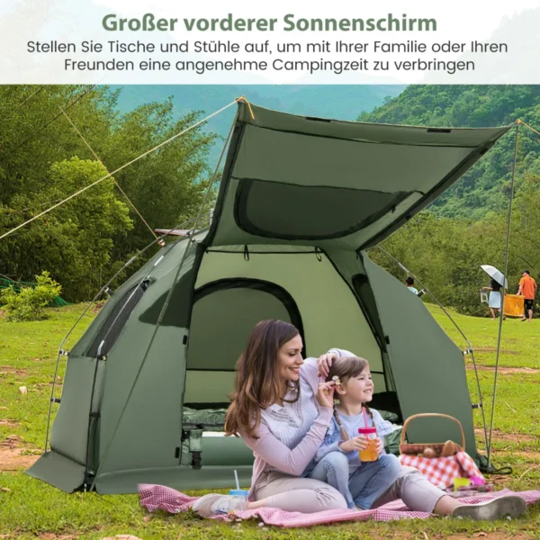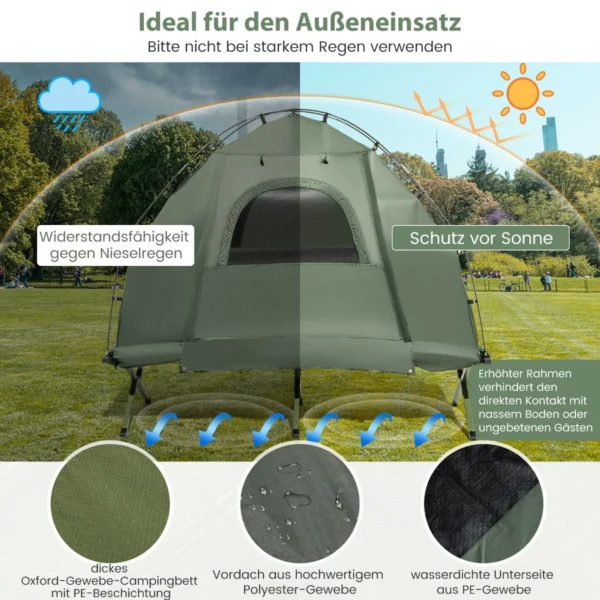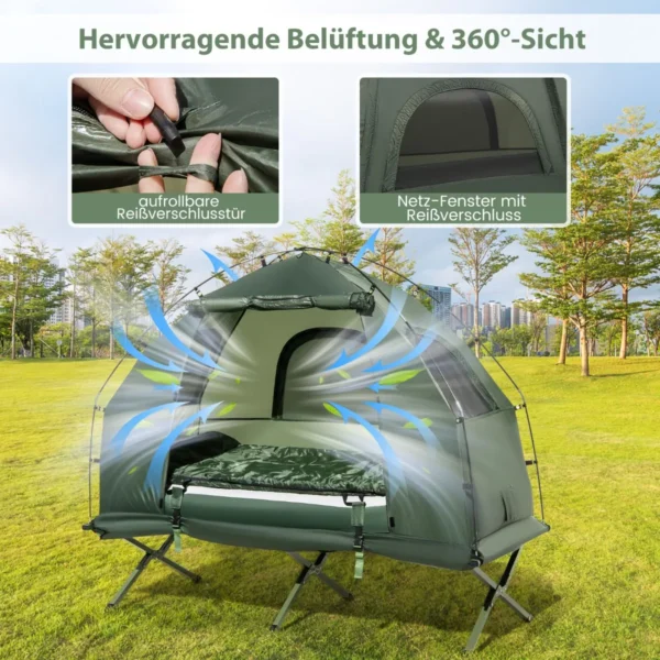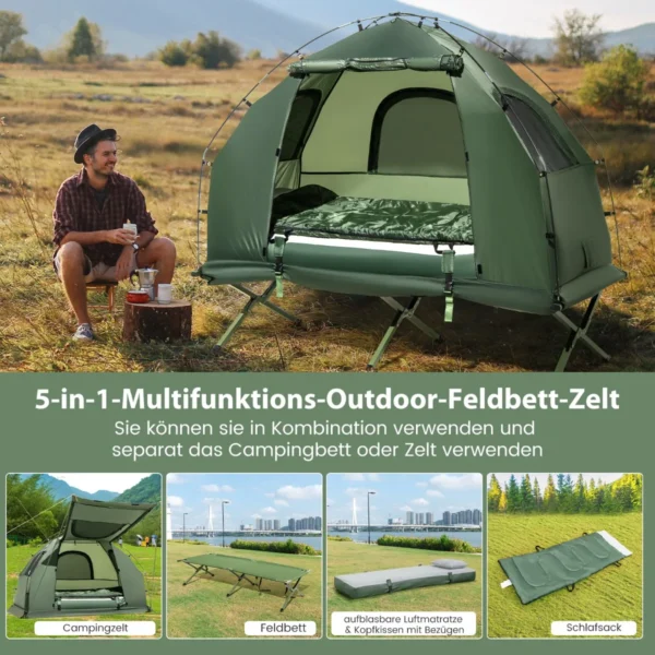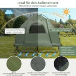 Palapinė 194x87x167cm, žalios spalvos, skirta vienam asmeniui, yra universali stovyklavimo įranga, apimanti stovyklavimo palapinę, lovą, miegmaišį ir pripučiamą čiužinį. Šis sulankstomas derinys suteikia komfortą ir praktiškumą lauke, užtikrindamas apsaugą nuo saulės, lietaus ir nepageidaujamų sąlygų.