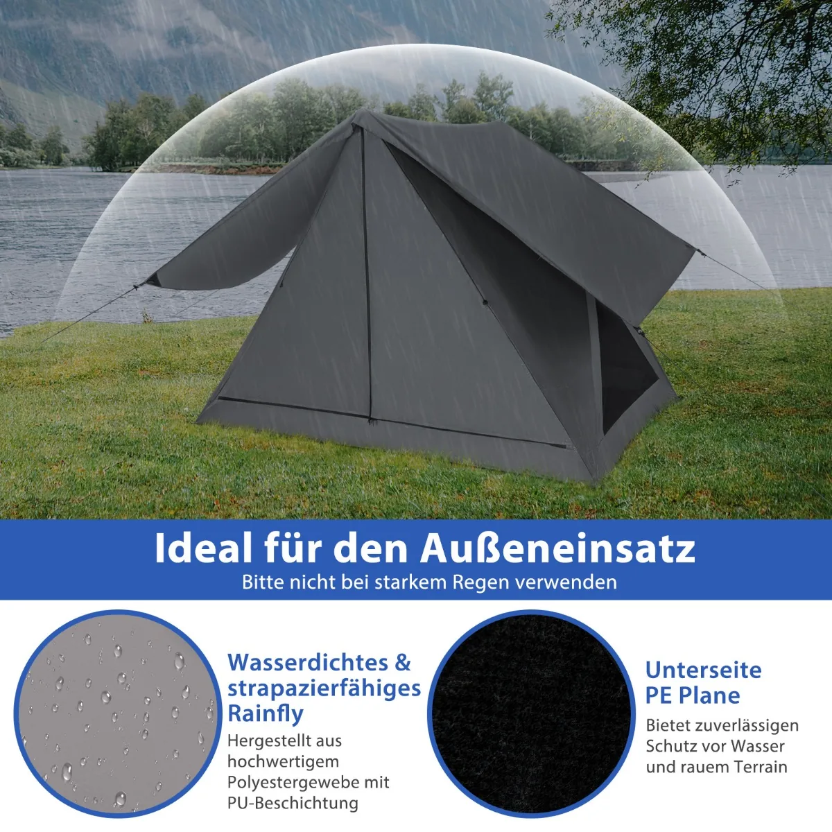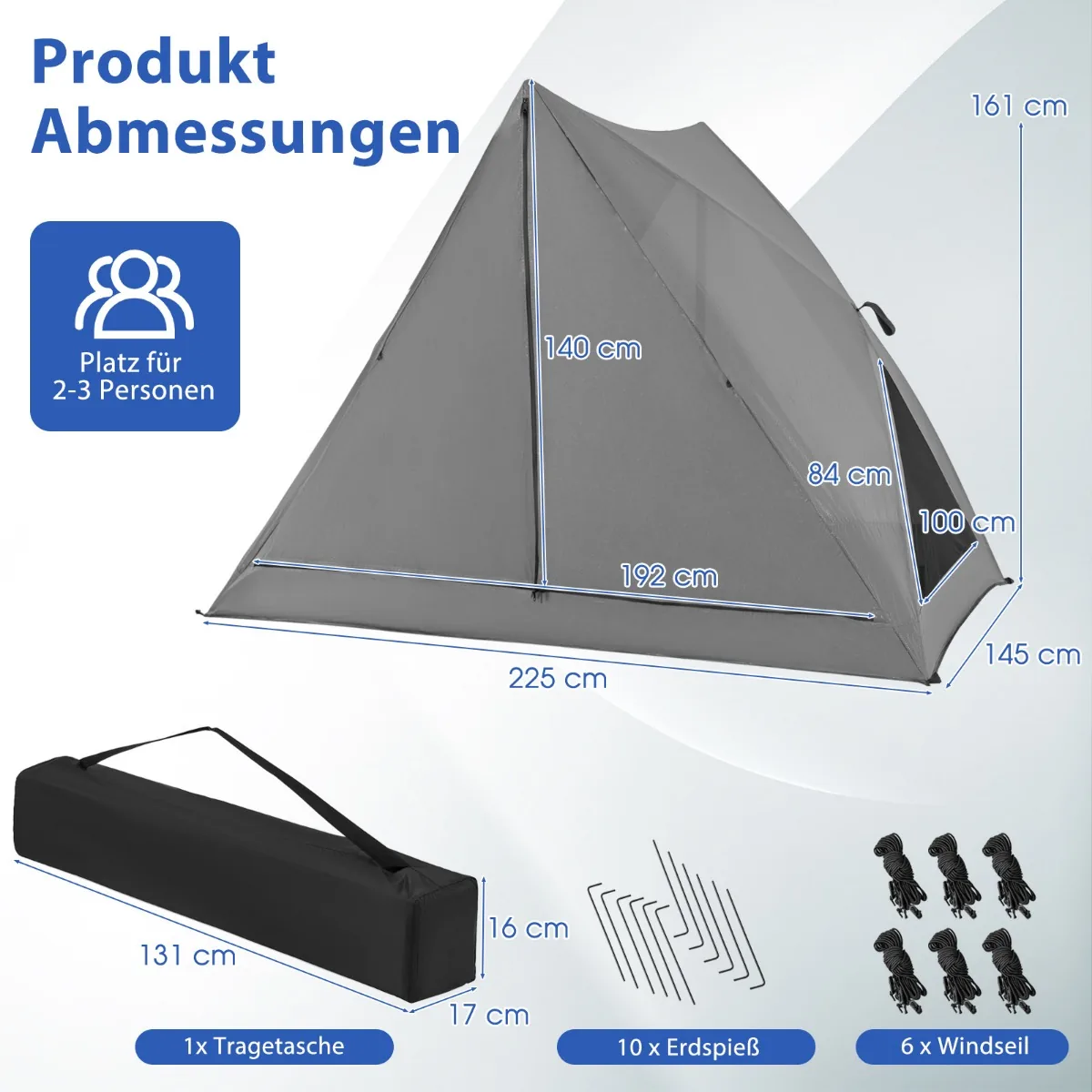 Palapinė 225x145x161cm pilkos spalvos puikiai tinka stovyklavimui, žygiams ir poilsiui gamtoje. Erdvūs matmenys leidžia patogiai tilpti 2-3 žmonėms, o konstrukcija užtikrina lengvą pastatymą ir atsparumą įvairioms oro sąlygoms.