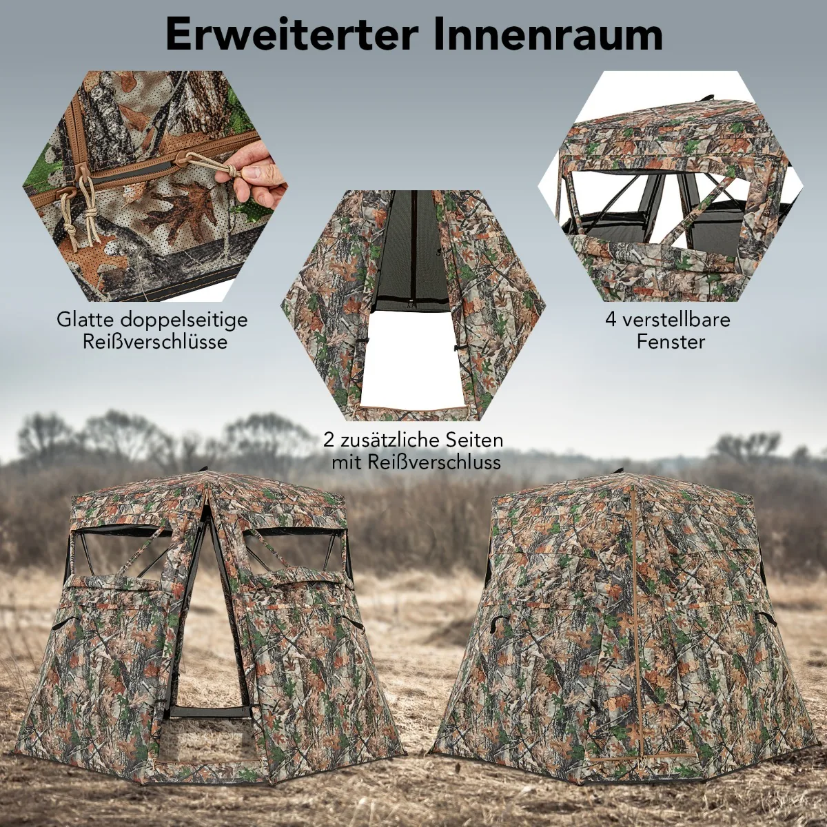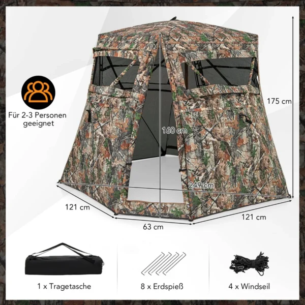 Palapinė 249x211x175 cm įvairių spalvų skirta medžioklei ir lauko veikloms. Tai patvari ir funkcionali palapinė su kamufliažiniu raštu, užtikrinanti komfortą ir tinkamą apsaugą gamtoje. Dėl savo išskirtinės konstrukcijos palapinė suteikia puikų matomumą ir didelį vidinį plotą.