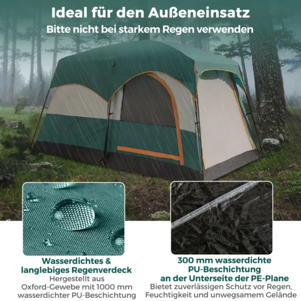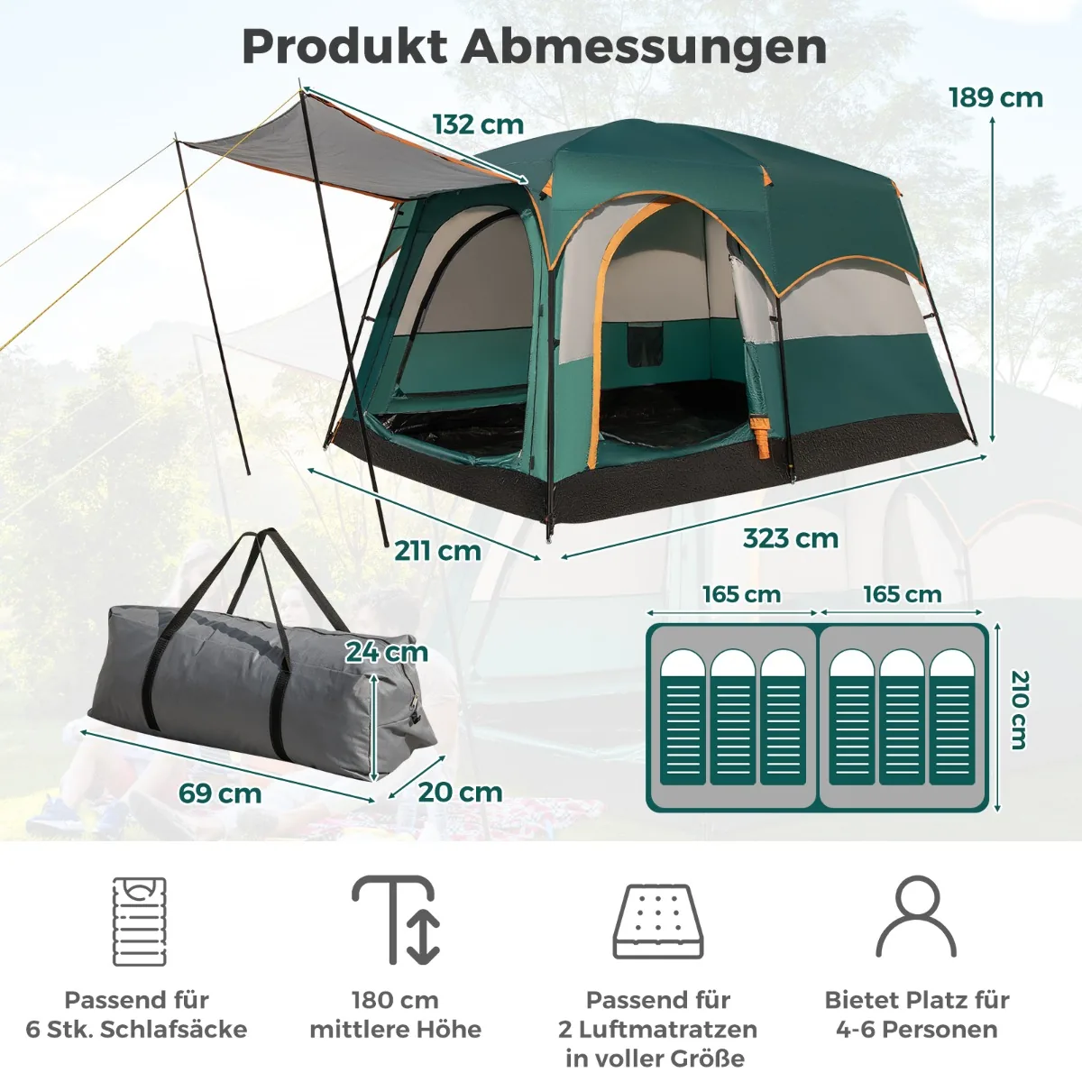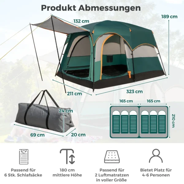 Palapinė 323x211x189cm, žalios spalvos, skirta kempingui su šeima ar draugais. Erdvi ir funkcionali palapinė talpina 4-6 asmenis ir tinkama įvairioms lauko veikloms, tokioms kaip žygiai, stovyklavimas ar festivaliai.