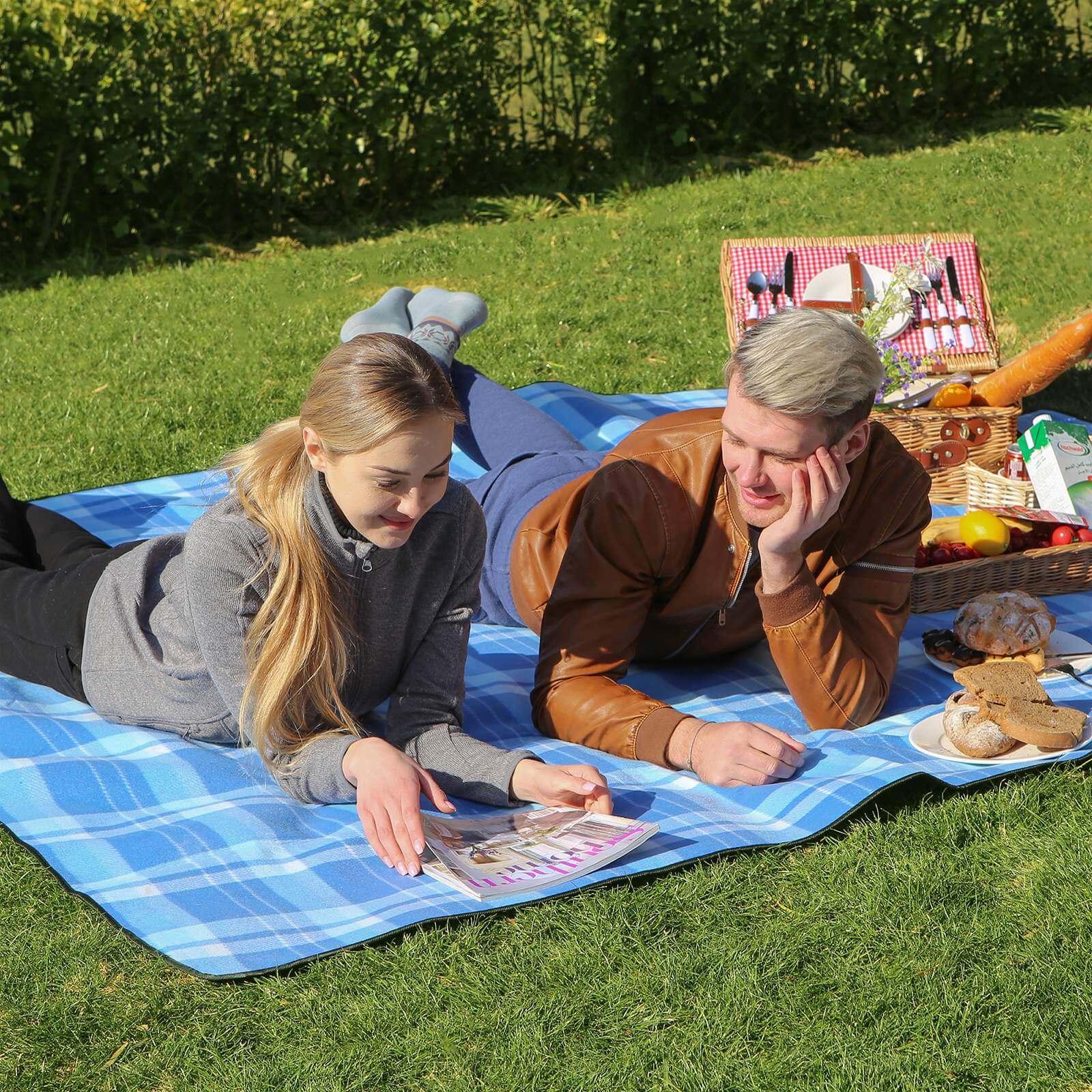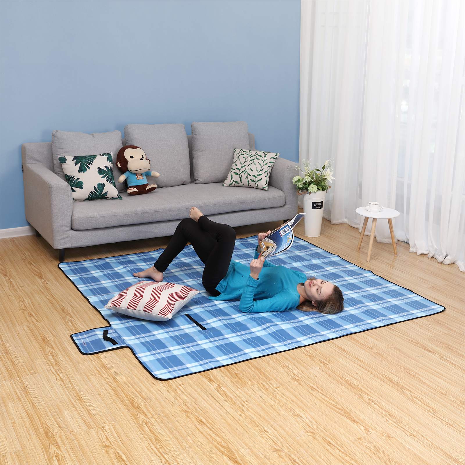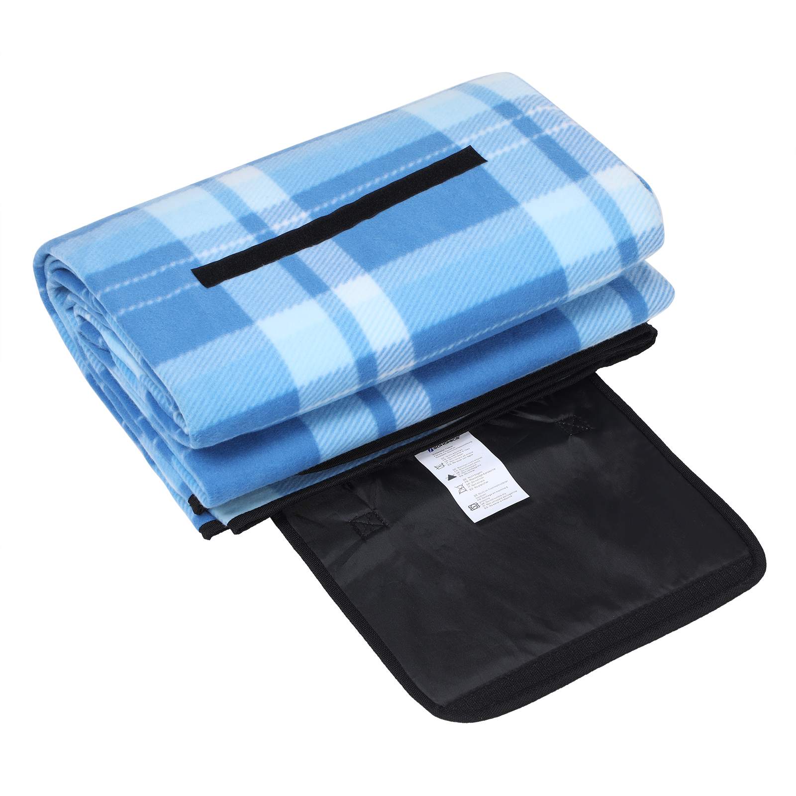 Paplūdimio iškylų antklodė / pledas su izoliacija XXL dydžio, mėlyna/balta 200 x 200 cm yra lengva ir tvirta, sudaryta iš trijų sluoksnių. Vilnos paviršius užtikrina švelnų gulėjimą, apmušalai suteikia komfortą ant kietos žemės, o izoliacinė aliuminio danga apačioje apsaugo nuo šlapių ir šaltų grindų. Taip išvengsite šlapios žolės ir nesušlapsite užpakalio.