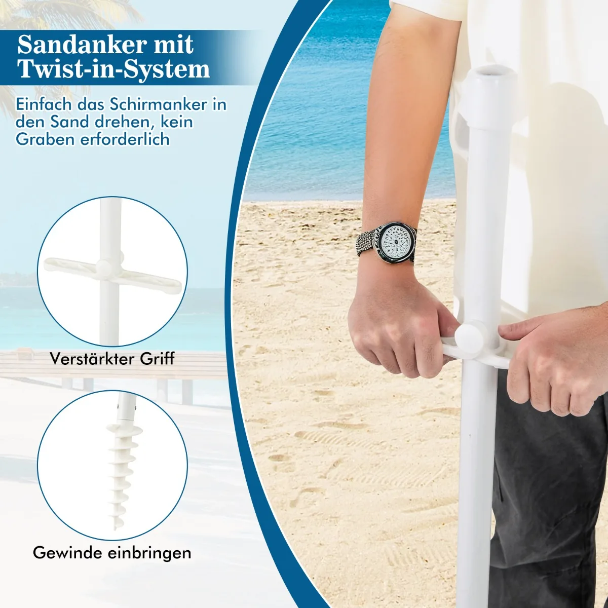 - Įmontuotas smėlio inkaras leidžia tvirtai įtvirtinti skėtį smėlyje ar žemėje, atsparus vėjui.