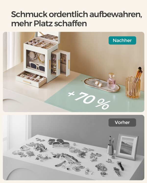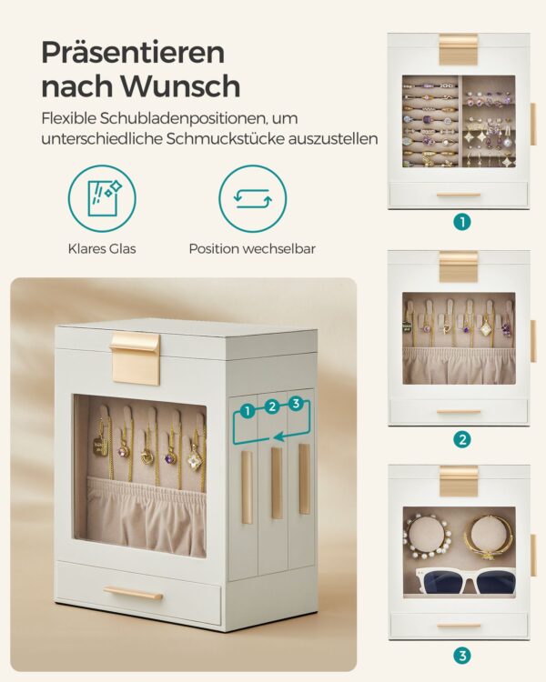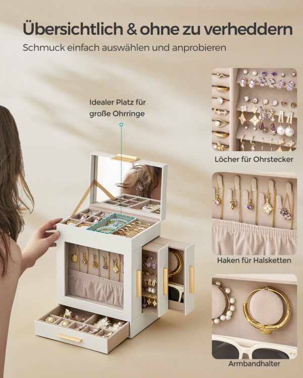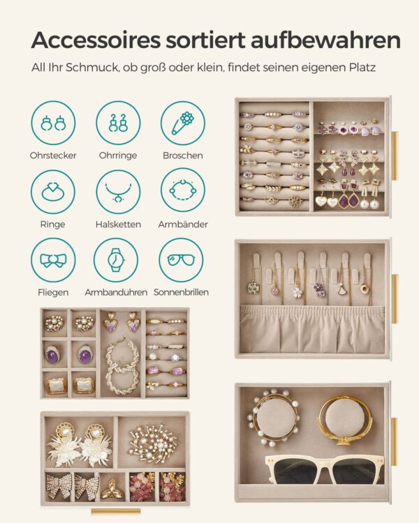 Ši papuošalų dėžutė ne tik apsaugo jūsų papuošalus, bet ir puikiai dera prie bet kokio interjero stiliaus, suteikdama jam elegancijos ir rafinuotumo.