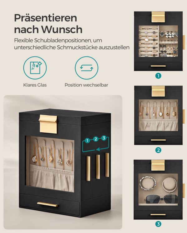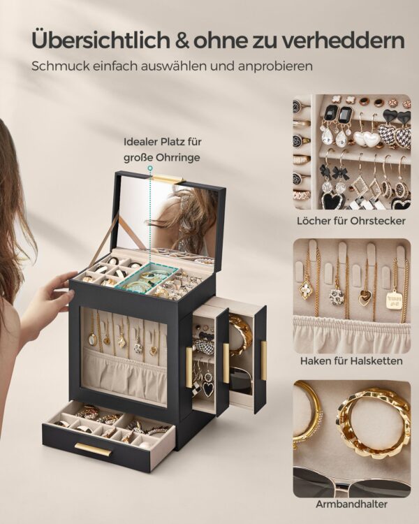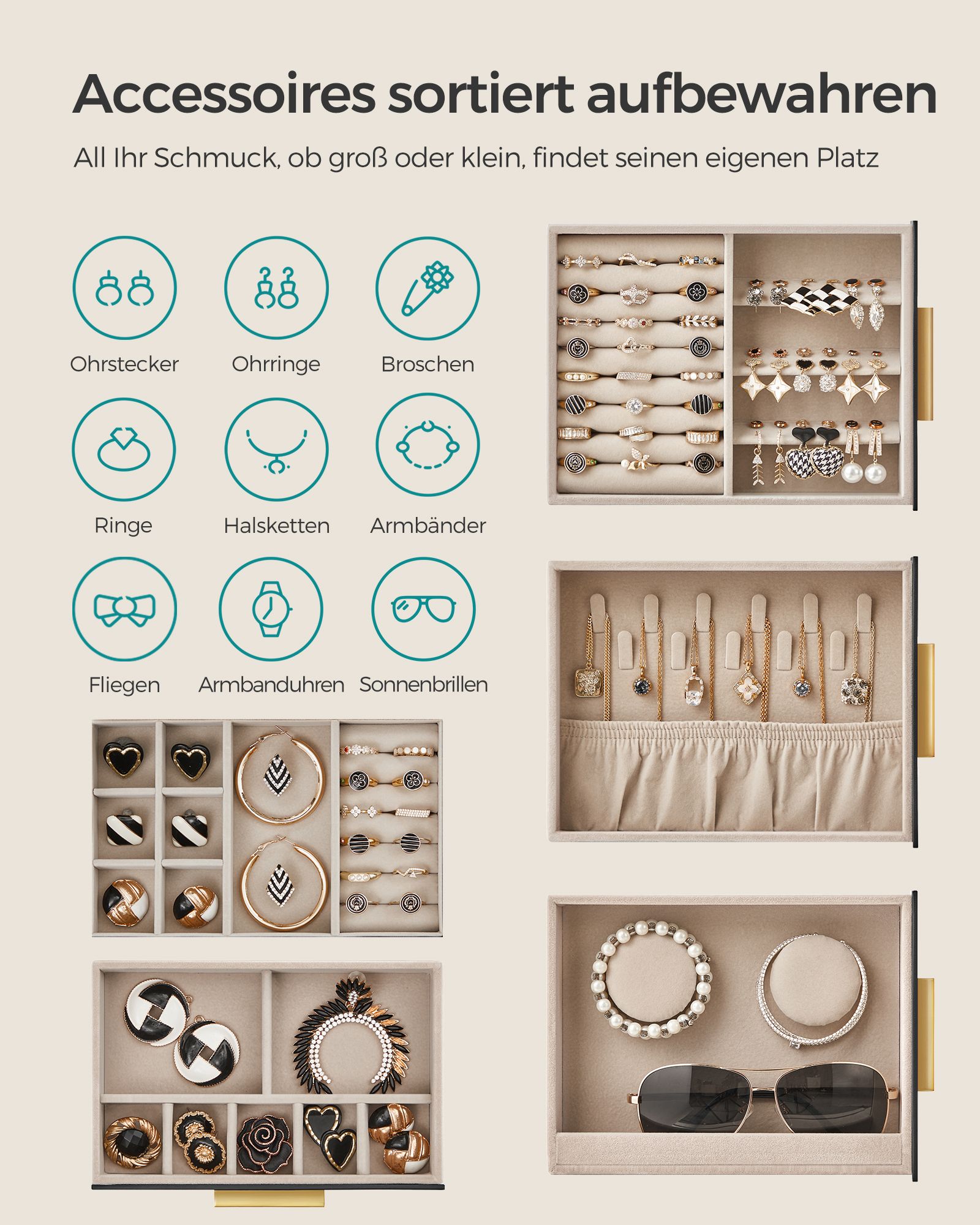 Ši prabangi papuošalų dėžutė yra puikus pasirinkimas tiems, kurie vertina stilių ir kokybę. Sukurta iš aukštos kokybės medžiagų, ji ne tik apsaugos jūsų brangiausius papuošalus, bet ir taps elegantišku interjero akcentu.