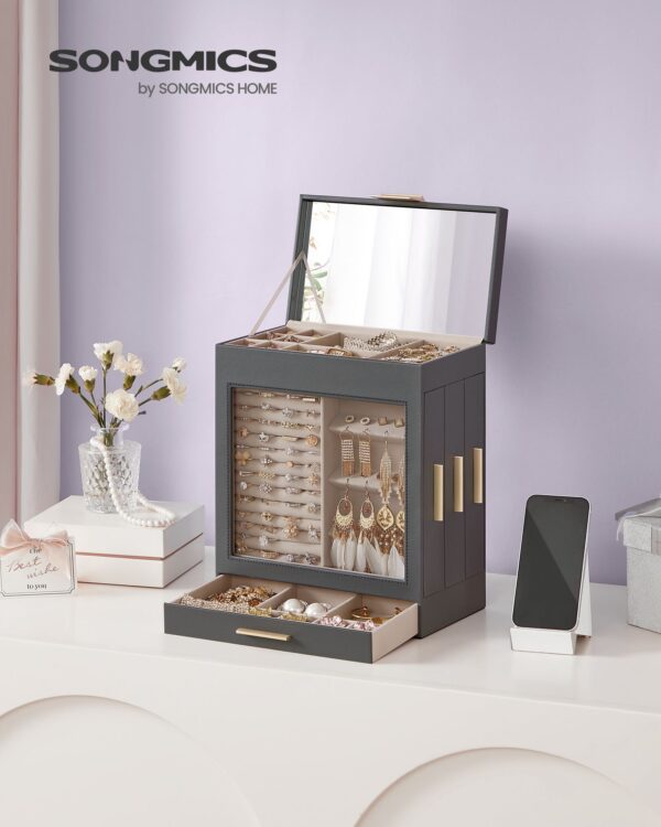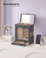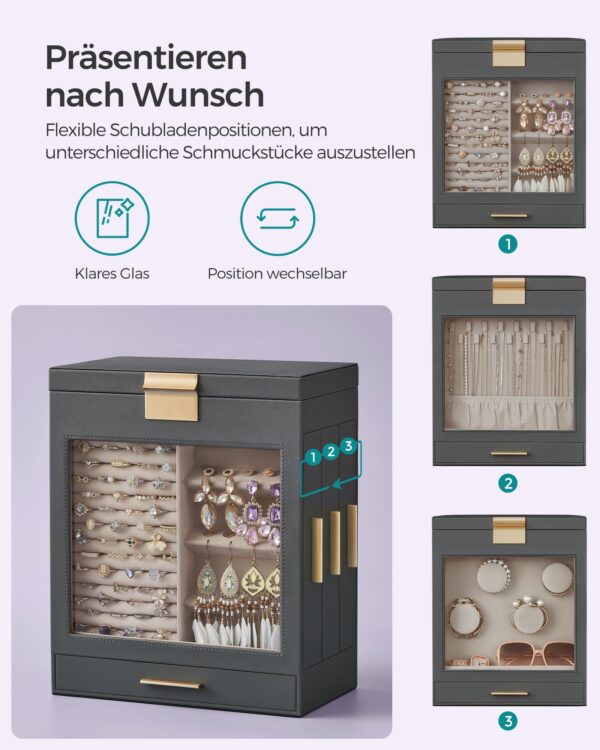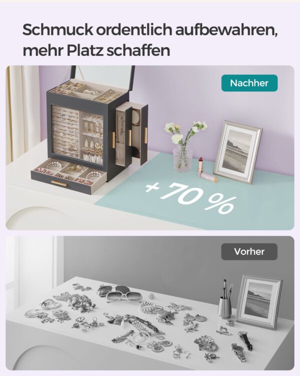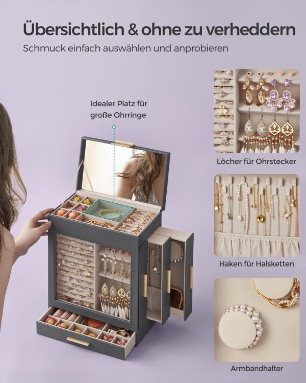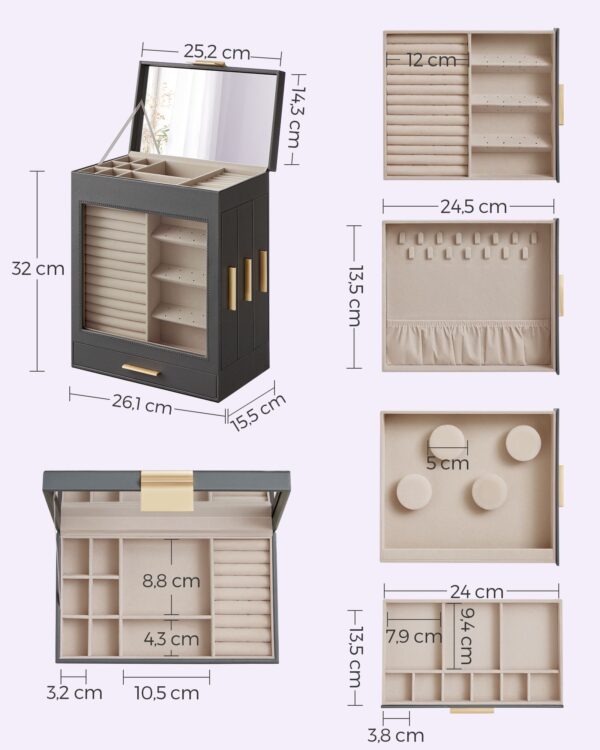 - Dydis: 15,5 x 26,1 x 32 cm (D x P x A) – pakankamai erdvus, kad tilptų įvairūs papuošalai, nuo žiedų iki karolių.