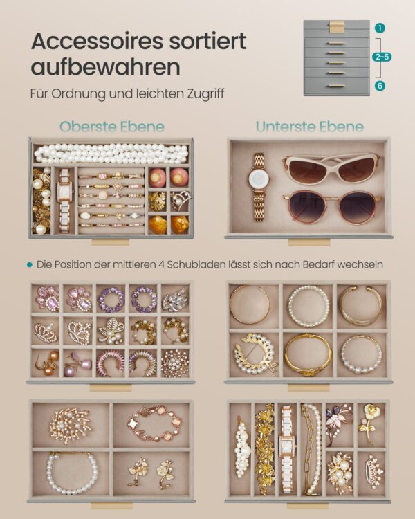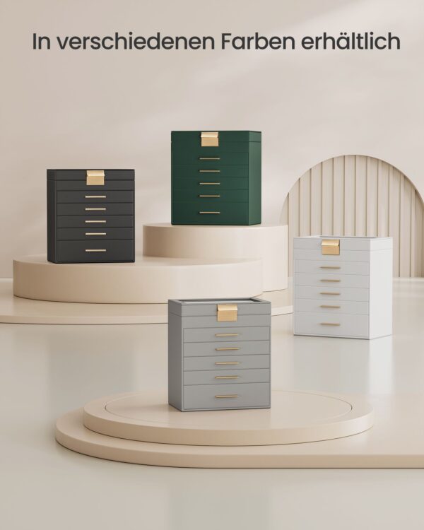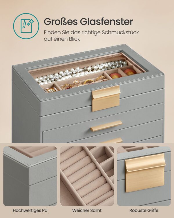 - Dydis: 16,3 x 25,1 x 29 cm (D x P x A) – kompaktiškas, bet talpus dizainas, tinkantis įvairiems papuošalams.