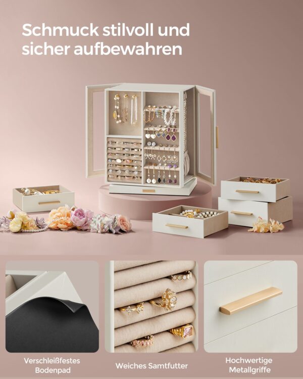 - Dydis: 16 x 22,2 x 28,5 cm (D x P x A) – kompaktiškas, tačiau pakankamai erdvus, kad tilptų visi jūsų mėgstamiausi papuošalai.