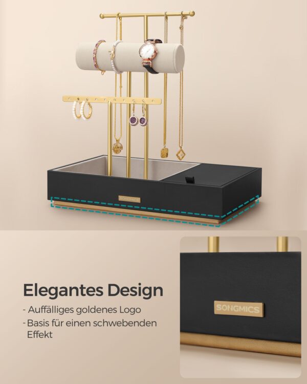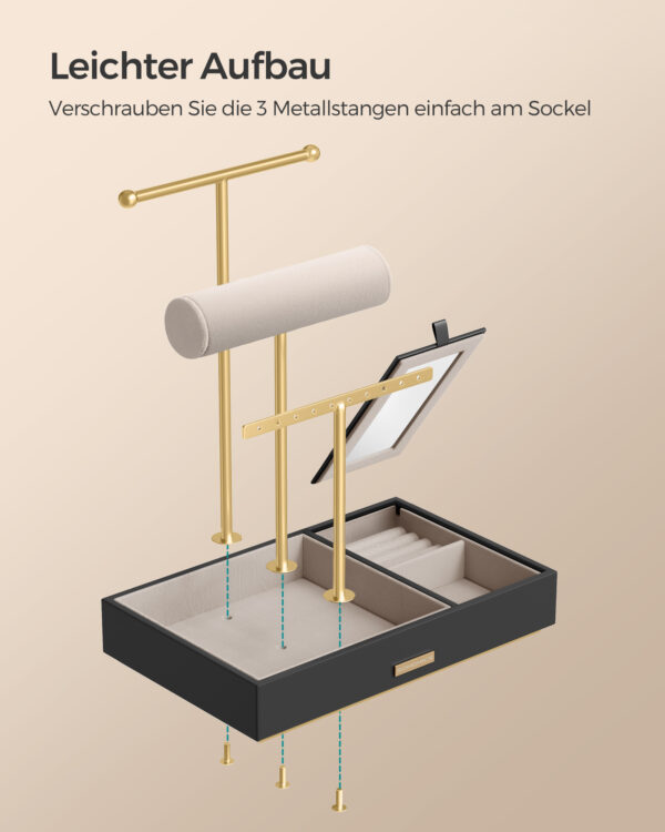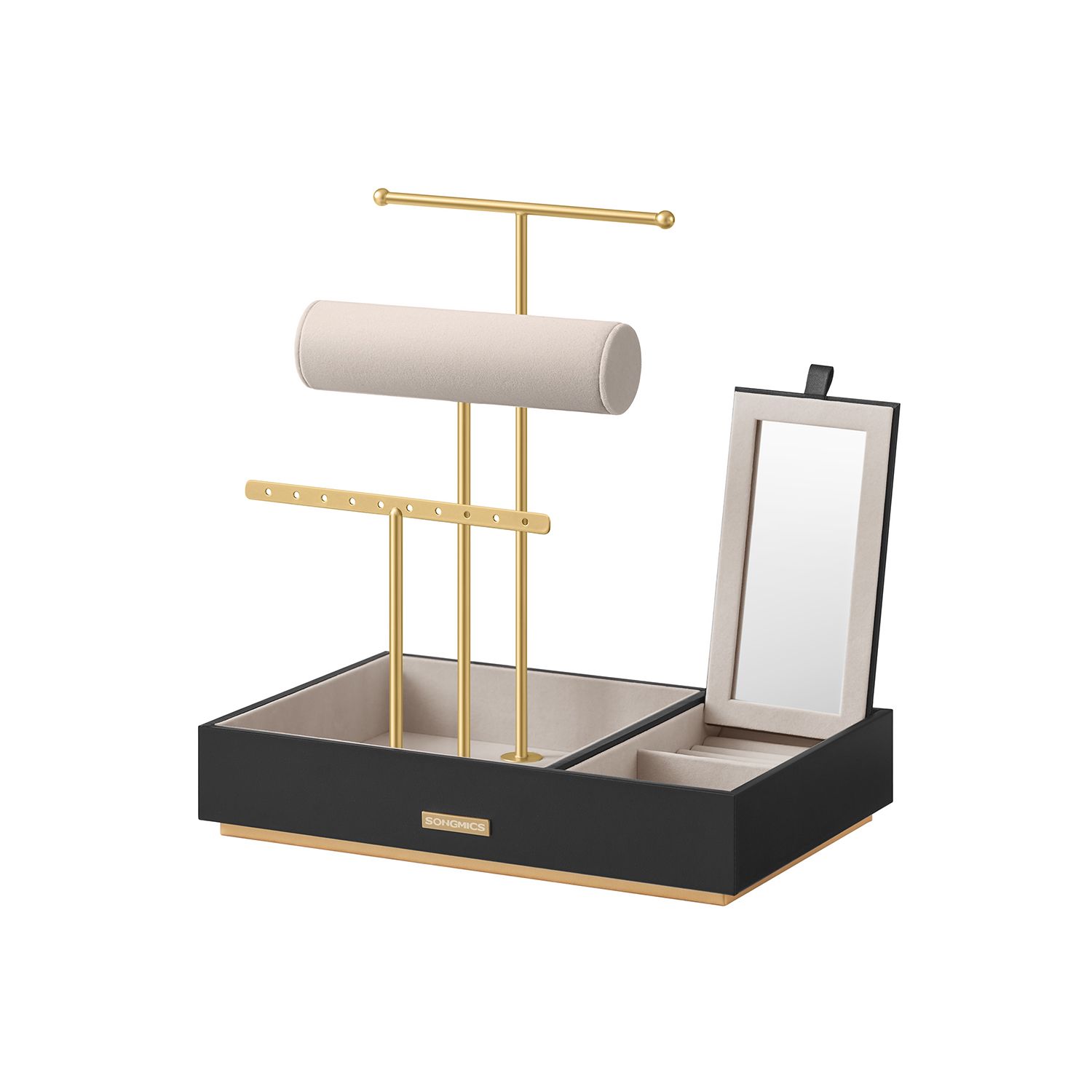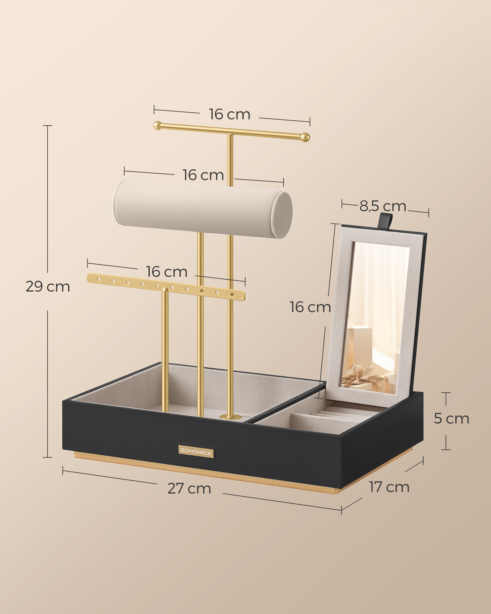 Ši elegantiška papuošalų dėžutė, kurios dydis yra 17 x 27 x 29 cm, yra puikus pasirinkimas jūsų brangenybėms laikyti. Juodos ir smėlio spalvos derinys suteikia prabangos ir stiliaus jūsų interjerui.