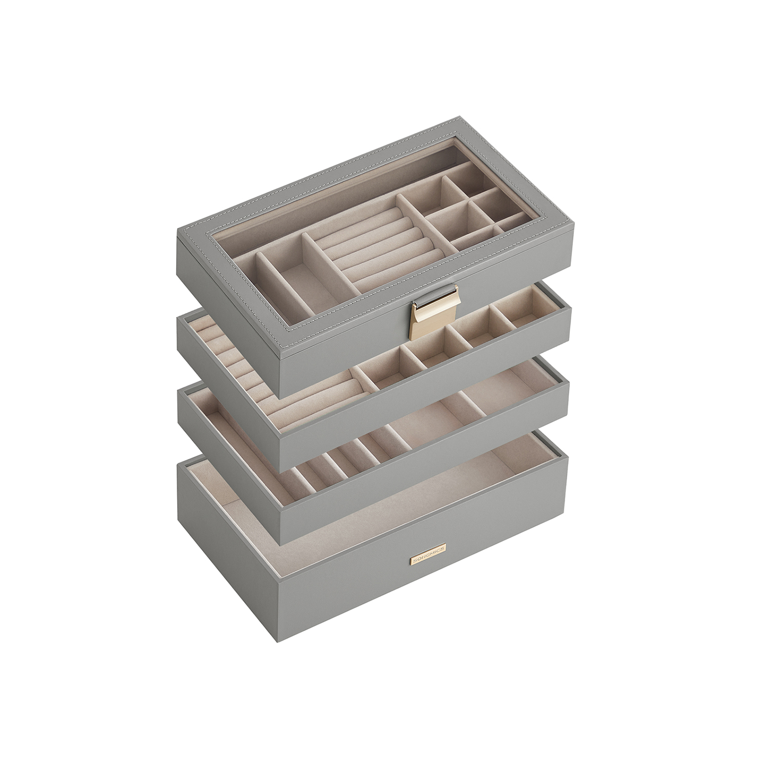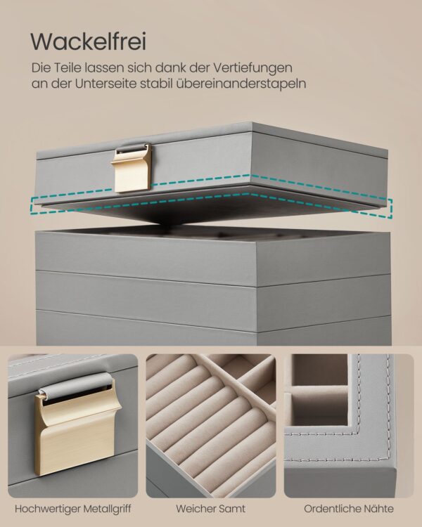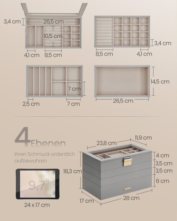 Dėžutė turi keturis lygius: pirmasis lygis yra 17 x 28 x 4 cm, antrasis ir trečiasis lygiai yra po 17 x 28 x 3,5 cm, o ketvirtasis lygis yra 17 x 28 x 6 cm. Tai leidžia patogiai ir tvarkingai laikyti įvairius papuošalus.