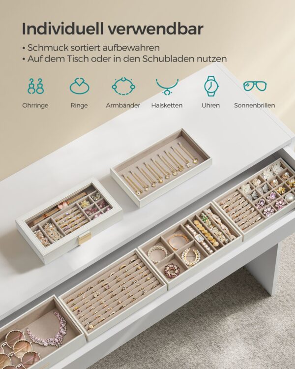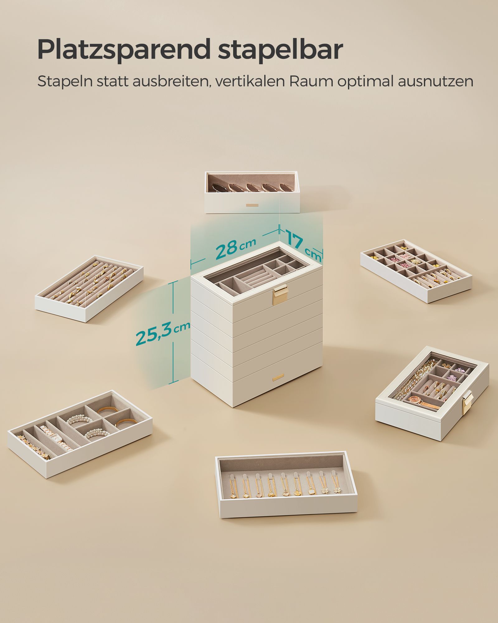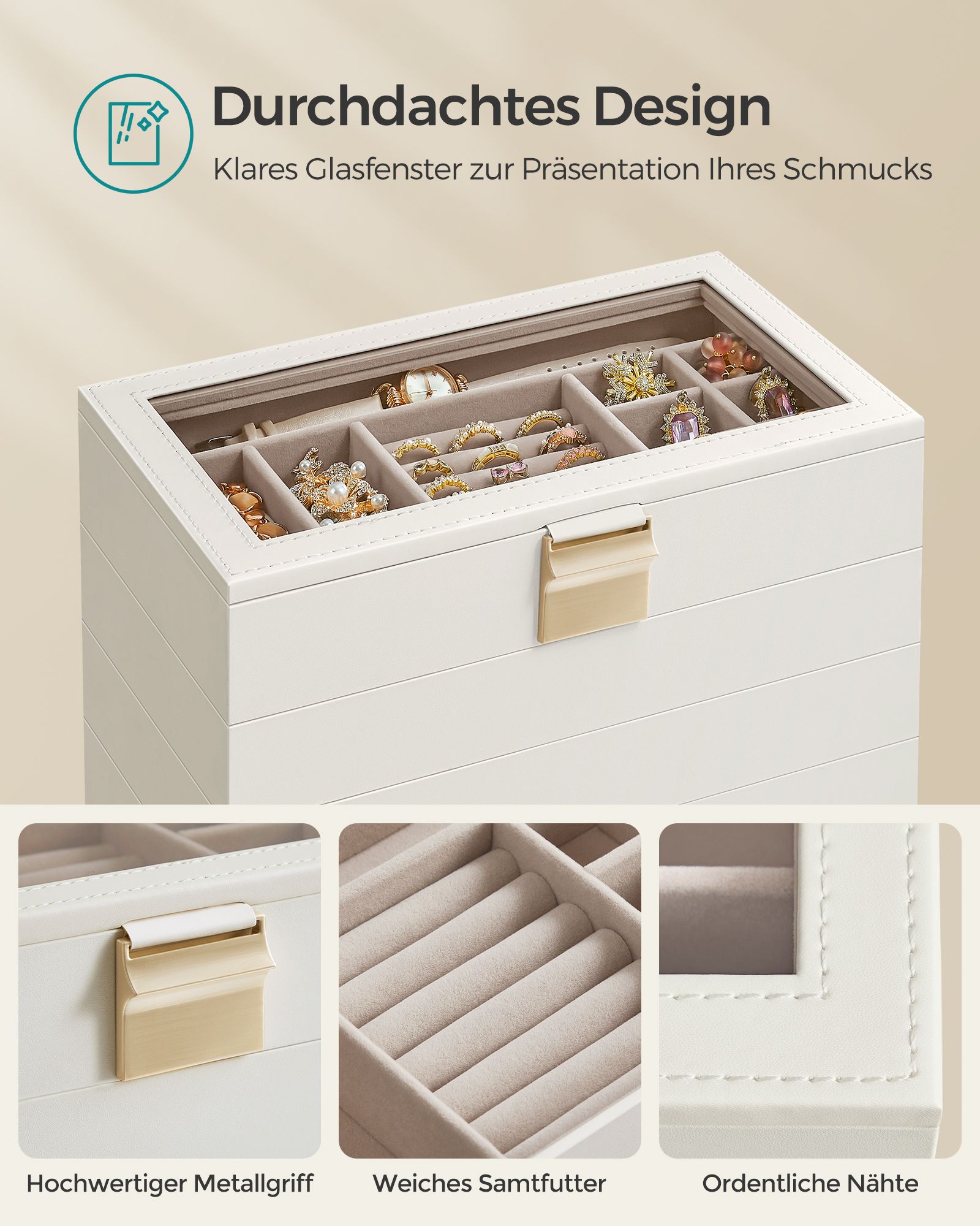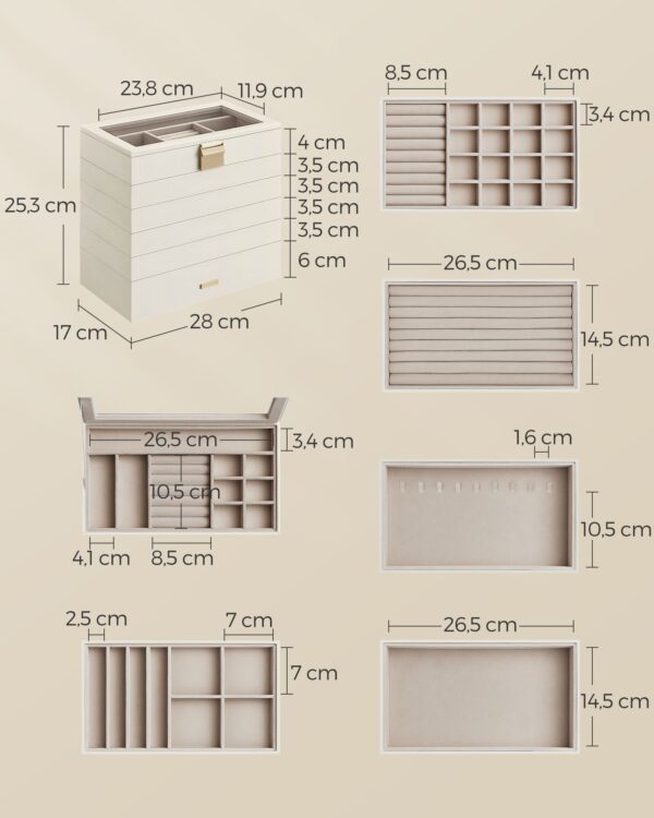 Ši elegantiška papuošalų dėžutė, debesų baltos spalvos, yra puikus sprendimas jūsų papuošalų ir aksesuarų laikymui. Jos modernus dizainas suteikia prabangos ir stiliaus jūsų interjerui.