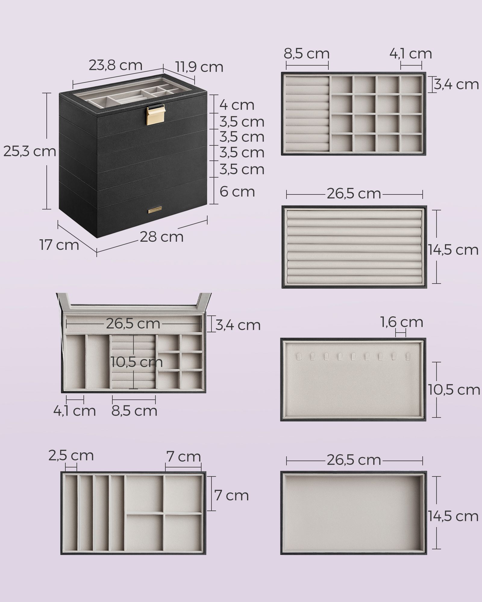Dėžutė turi 6 lygius: pirmasis lygis yra 17 x 28 x 4 cm, antrasis, trečiasis, ketvirtasis ir penktasis lygiai yra po 17 x 28 x 3,5 cm, o šeštasis lygis yra 17 x 28 x 6 cm.