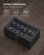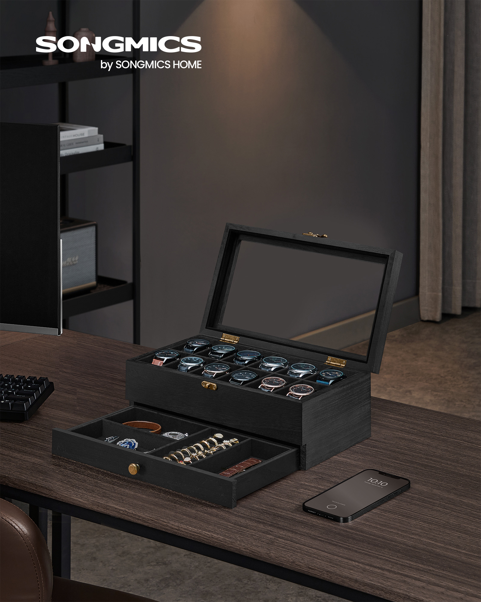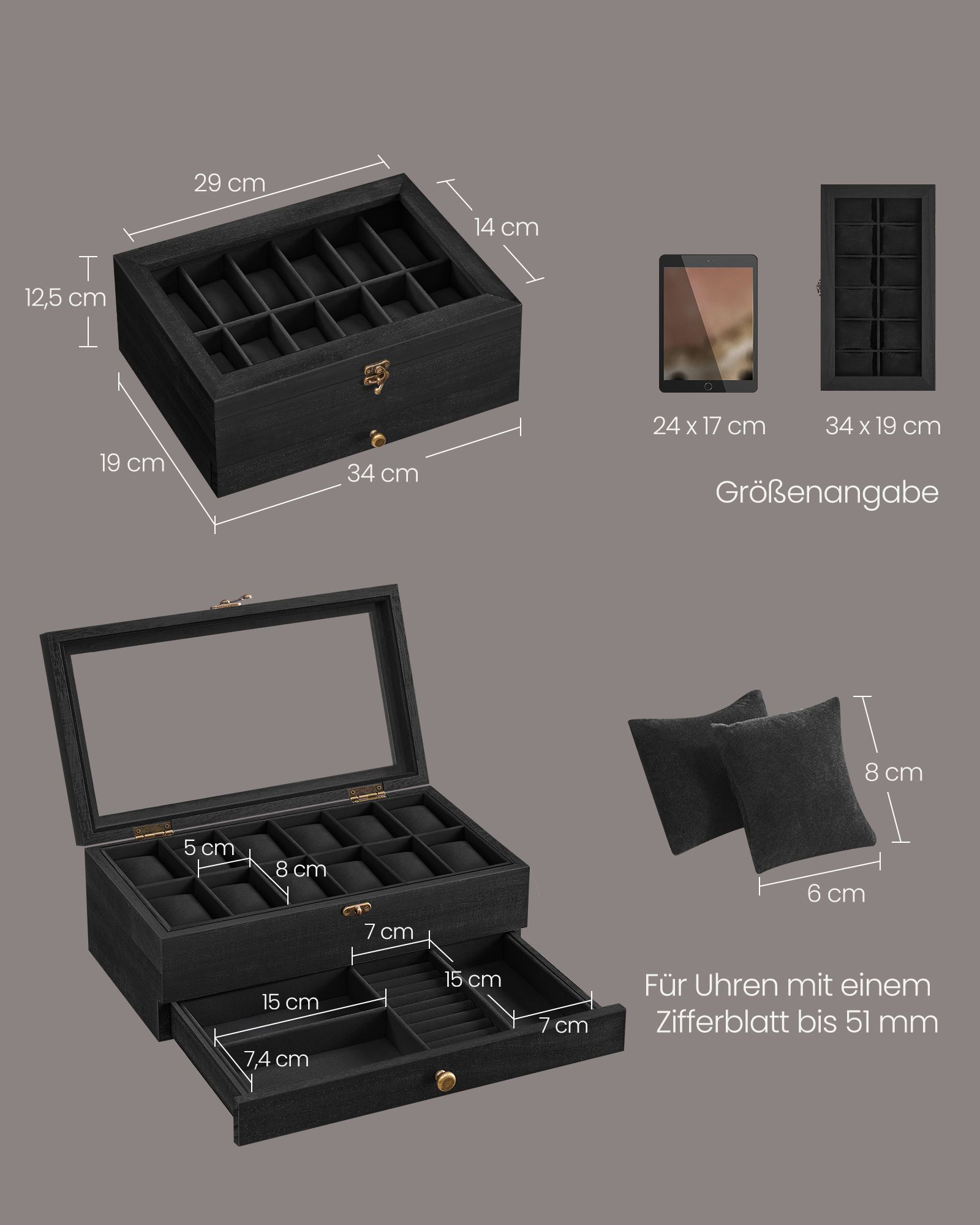 Pagaminta iš aukštos kokybės Paulownia medienos, aksomo ir stiklo, ši dėžutė yra tvirta ir ilgaamžė. Jos matmenys yra 19 x 34 x 12,5 cm (D x P x A), o svoris siekia 1,6 kg.