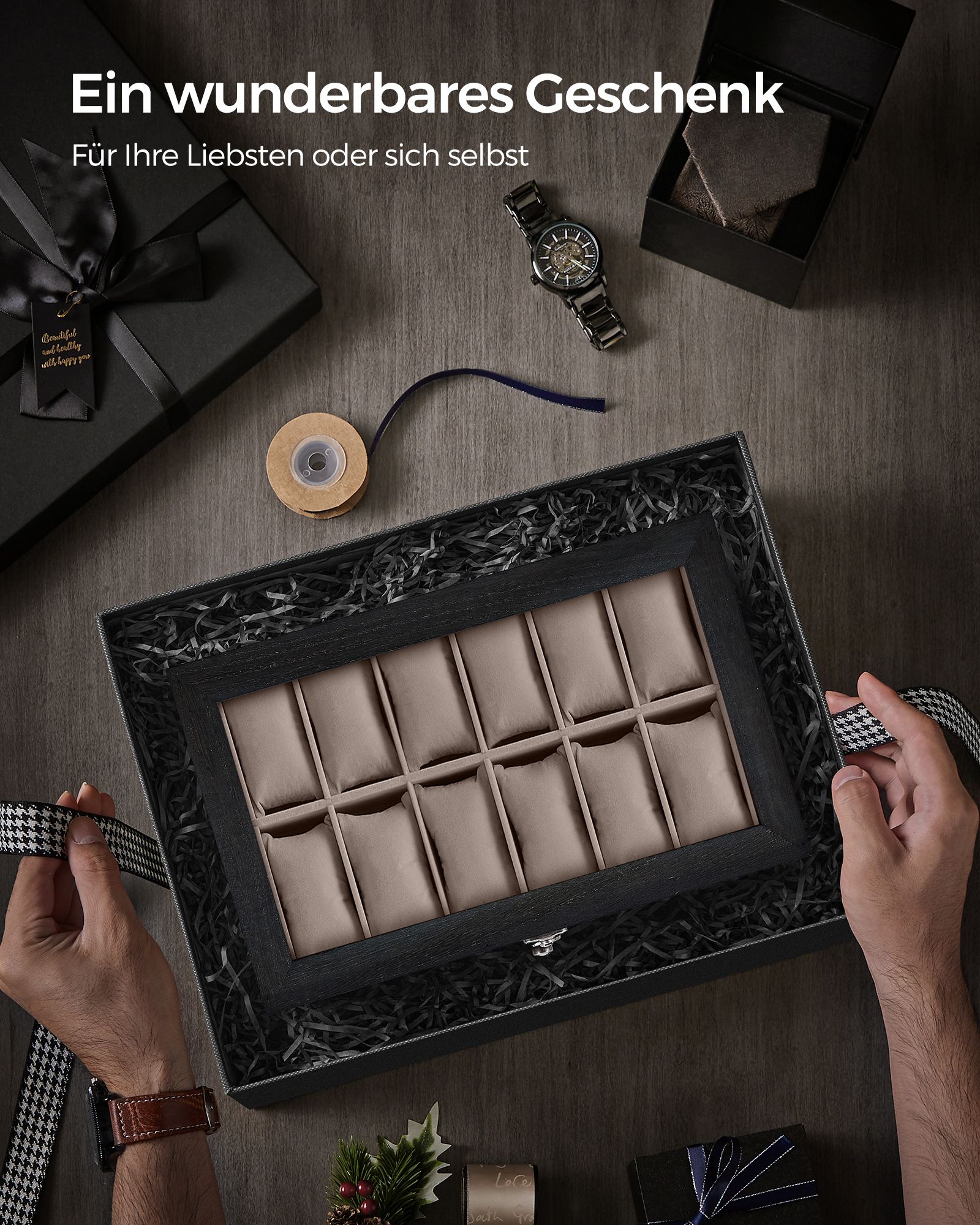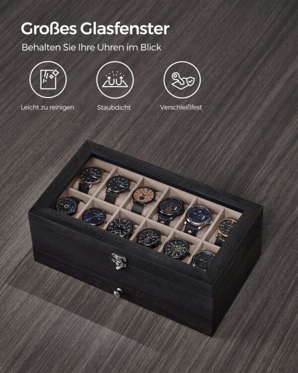 Pagaminta iš aukštos kokybės Paulownia medienos, aksomo ir stiklo, ši dėžutė yra tvirta ir ilgaamžė. Jos dydis yra 19 x 34 x 12,5 cm (D x P x A), o svoris siekia 1,6 kg.