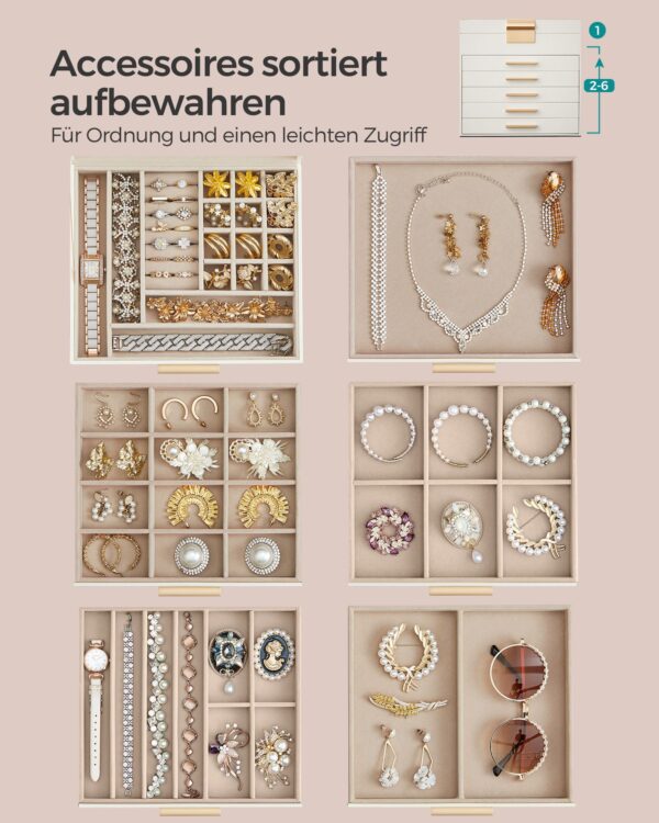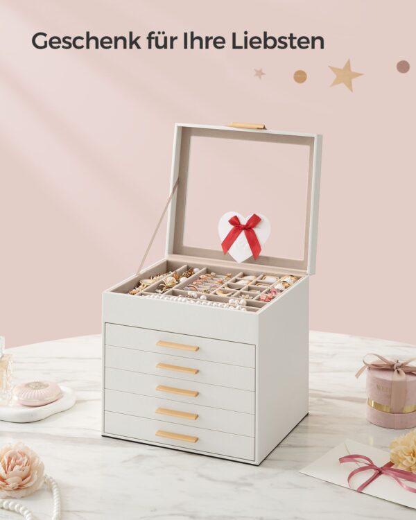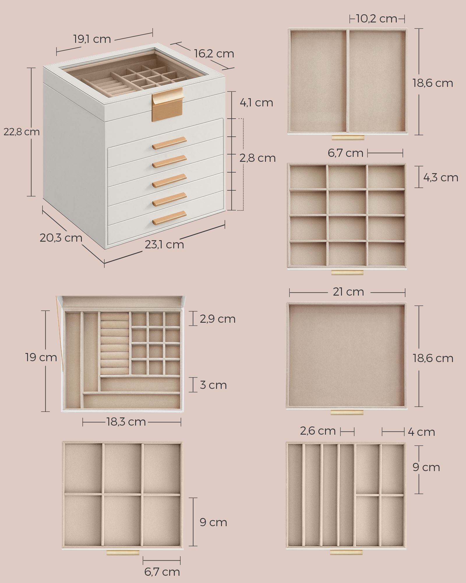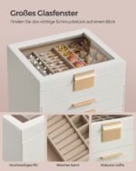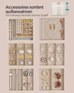 - Dydis: 20,3 x 23,1 x 22,8 cm (D x P x A) – kompaktiškas, tačiau talpus dizainas, leidžiantis patogiai laikyti įvairius papuošalus.