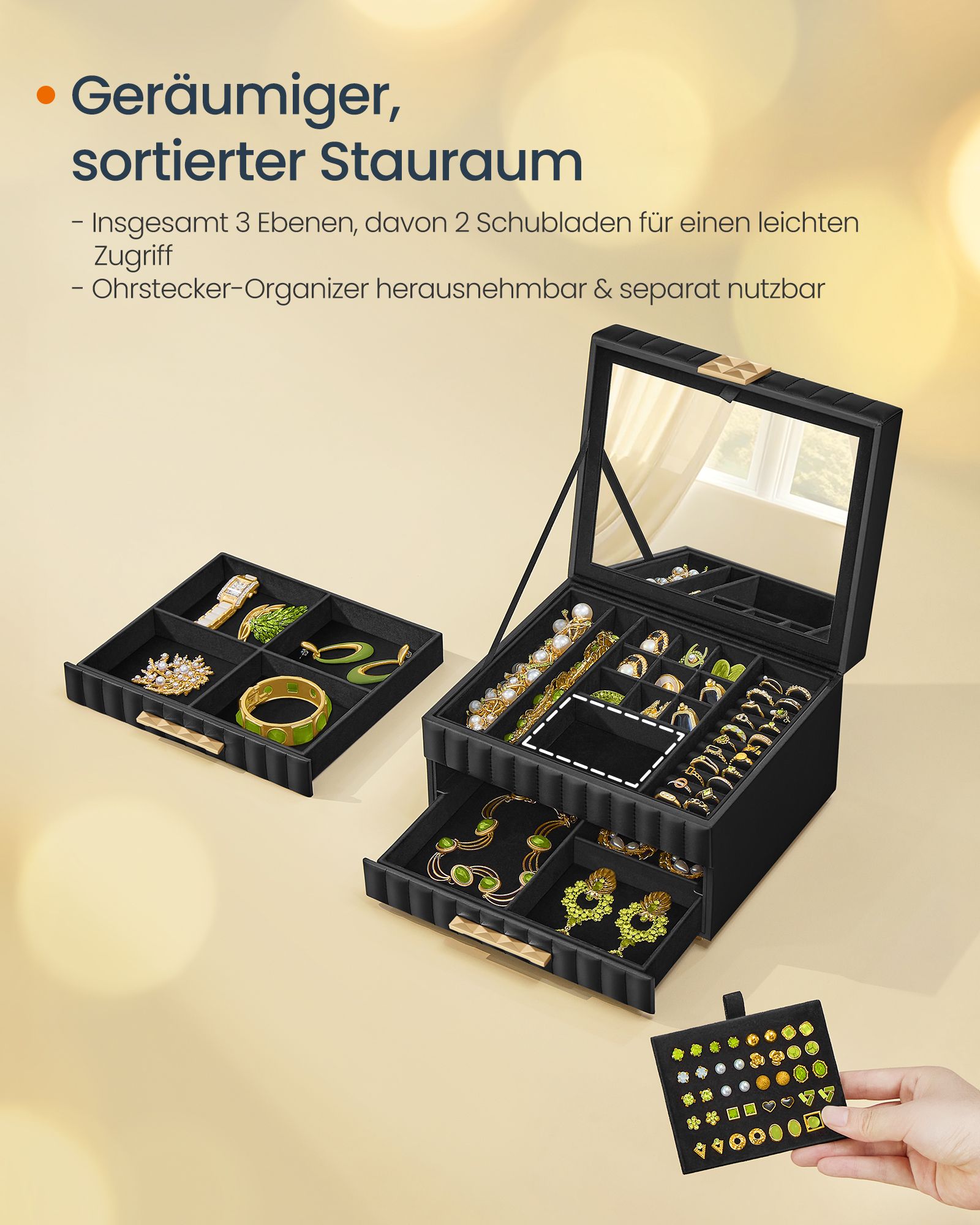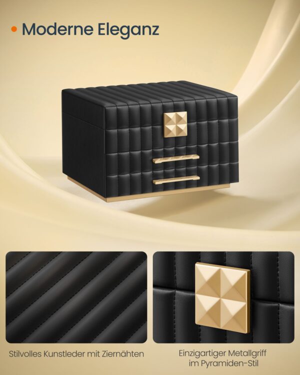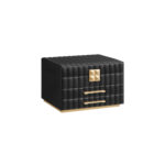 Ši elegantiška papuošalų dėžutė, juodos ir auksinės spalvos, yra puikus sprendimas jūsų brangenybių laikymui. Jos modernus dizainas suteikia prabangos ir stiliaus jūsų interjerui.