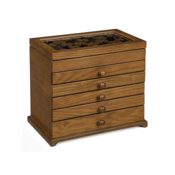 • 1 aukštas: 12 skyrių (kiekvienas 4,5 x 4,5 cm) ir žiedo lizdas (15,5 x 7,5 cm) auskarams, sagėms ir žiedams rūšiuoti.