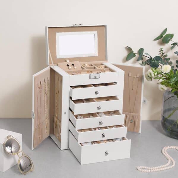 Atraskite kiekvieno papuošalo grožį. Ar jūsų brangenybės išsibarsčiusios po namus, o kai kurios iš jų nebuvo dėvimos ilgą laiką, nes pamiršote, kur jos yra? Tuomet turėtumėte išbandyti šį papuošalų organizatorių! Daugybė skyrių leidžia laikyti brangenybes aiškiai ir lengvai pasiekiamoje vietoje. Tiesiog išsirinkite tinkamus papuošalus iš šios dėžutės ir grožėkitės dideliame veidrodyje ant dangtelio!