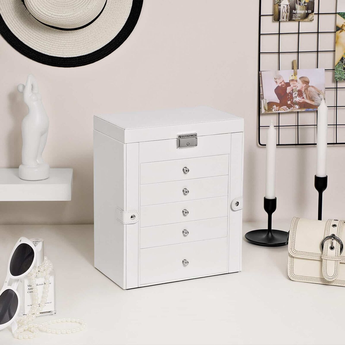 Paprastumas yra kasdienybė. Baltas paviršius, blizgūs metaliniai elementai, paprasta išvaizda – ši papuošalų dėžutė skleidžia nesenstantį žavesį ant tualetinio staliuko ar juvelyrinių dirbinių parduotuvėje. Naudodami šią dėžutę galėsite tvarkingai laikyti savo spindinčius papuošalus vienoje vietoje – kokia šventė akims! Be to, ši dėžutė puikiai tiks kaip dovana jūsų draugams ir artimiesiems.