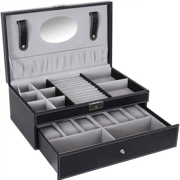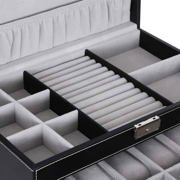 Universalus naudojimas: Puikiai tinka asmeniniam ir verslo reikmėms. Papuošalų dėžutė su laikrodžių skyreliais puikiai tinka pristatyti ar laikyti savo laikrodžius. Jūsų laikrodžiai laikomi tvarkingai, taupant vietą ir visada pasiruošę po ranka.