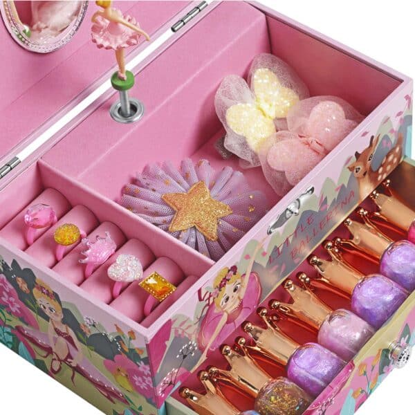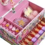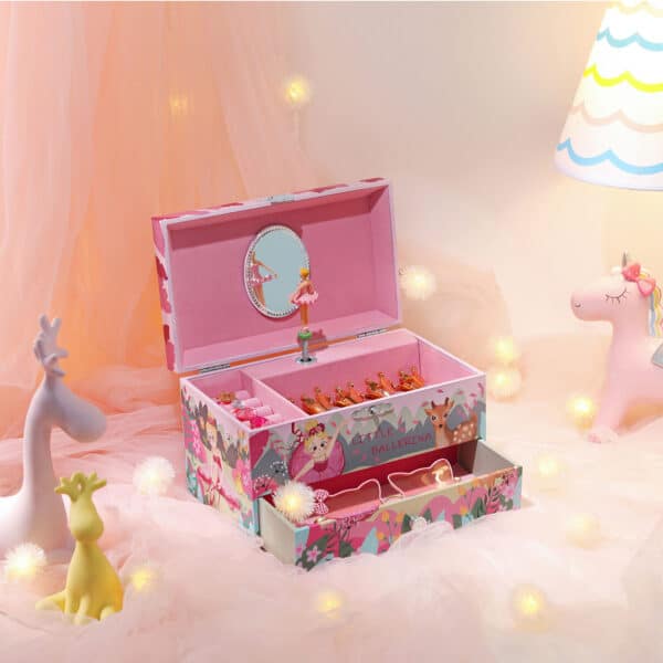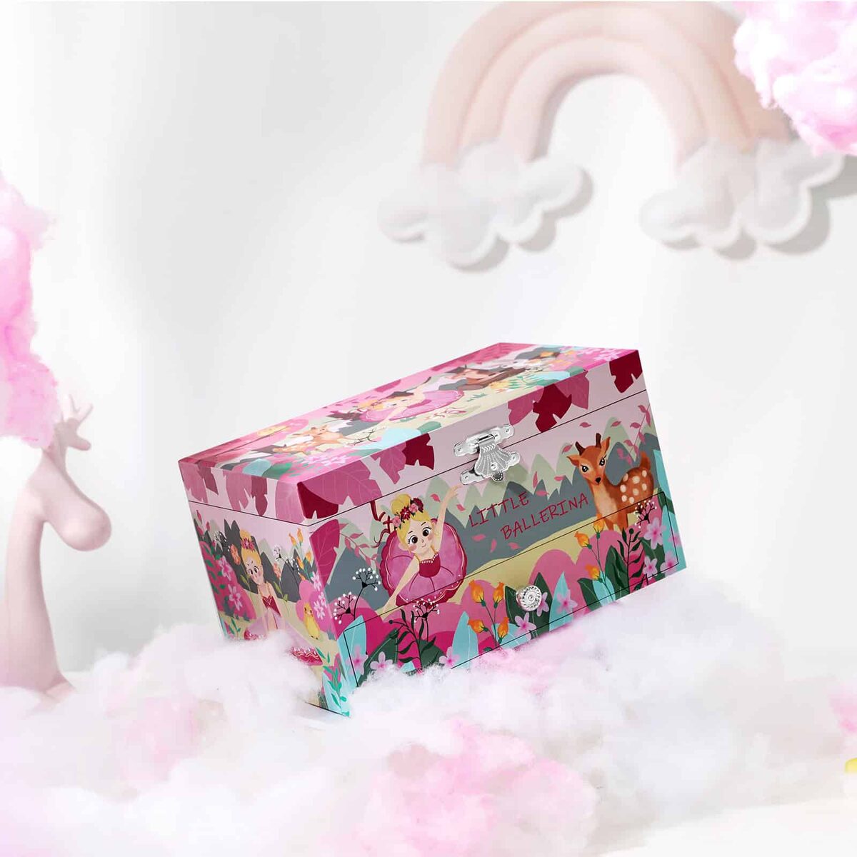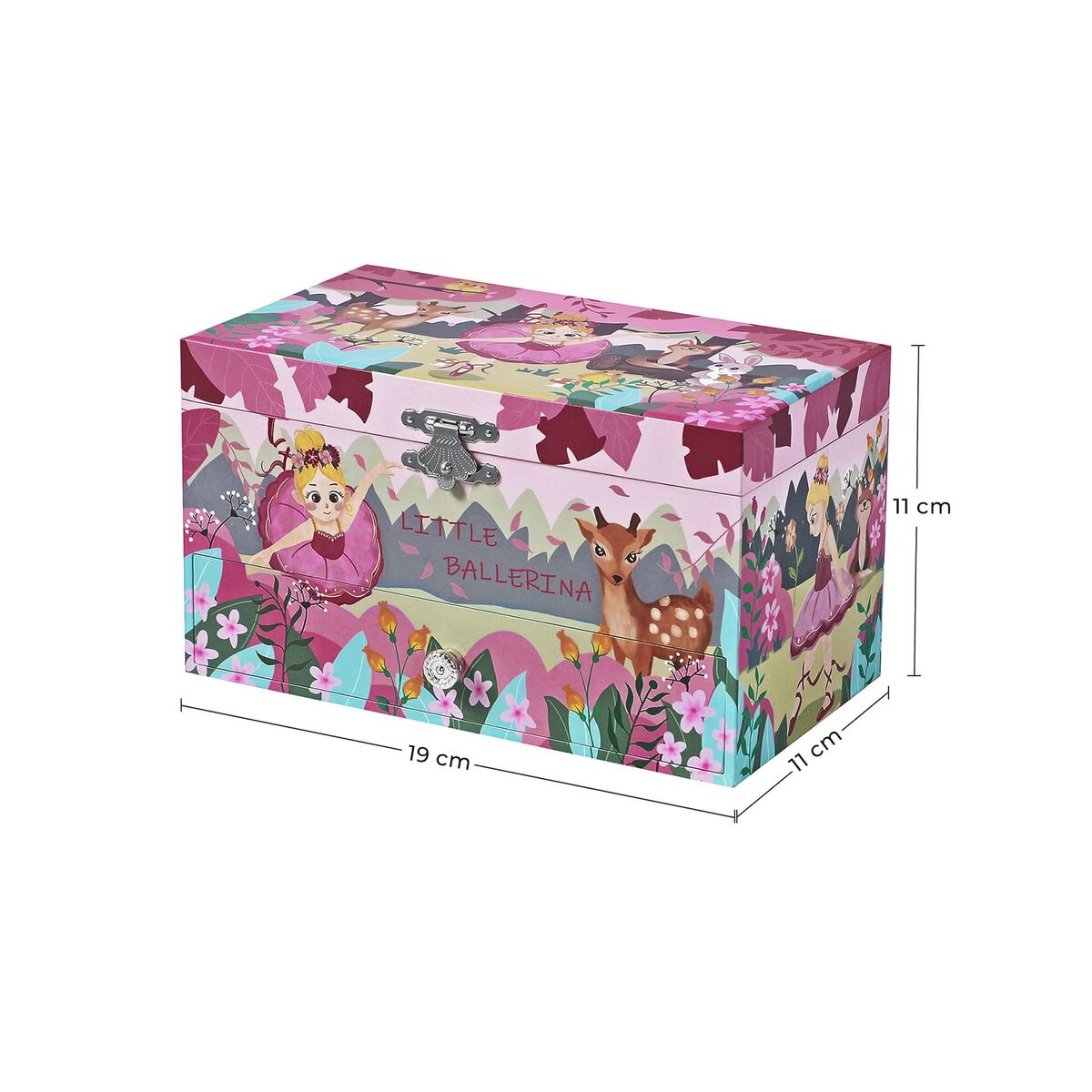 Gerai saugokite vaikystės prisiminimus su šia nuostabia papuošalų dėžute su muzika vaikams. Stabilus medžio dulkių plokštė (MDF) korpusas, aukštos kokybės muzikos mechanizmas, ABS veidrodis ir minkštas aksominis pamušalas užtikrina, kad ši muzikinė dėžutė tarnaus ilgai. Jūsų mergaitė galės naudoti ją lipdukams su animacinių filmų personažais ar dovanoms, kurios pažymi nepamirštamas jos vaikystės akimirkas, laikyti.