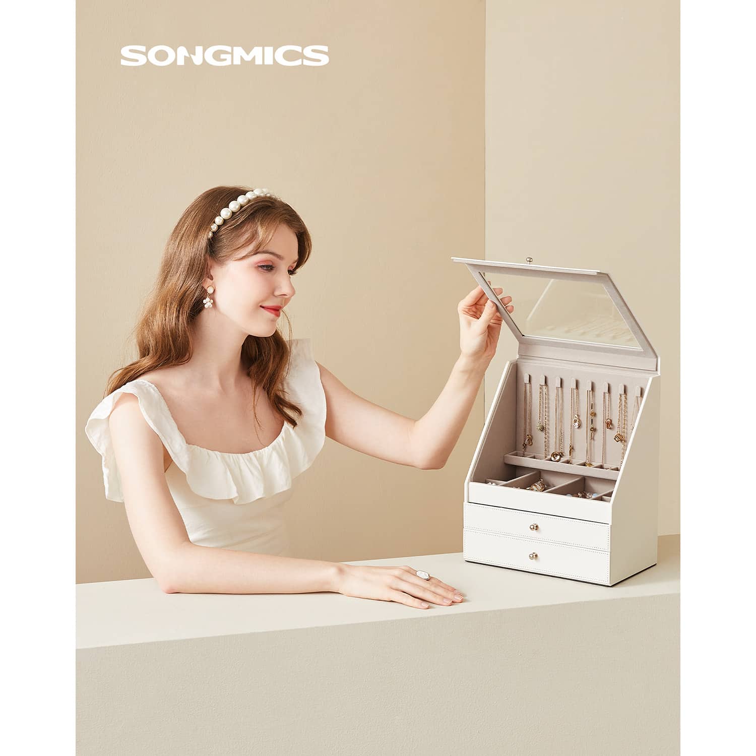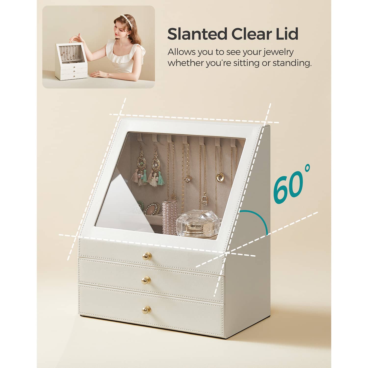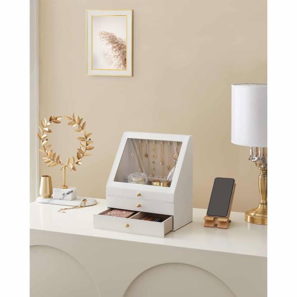 Papuošalų dėžutė su pasvirusiu stiklu ir papildomais stalčiais, baltos spalvos