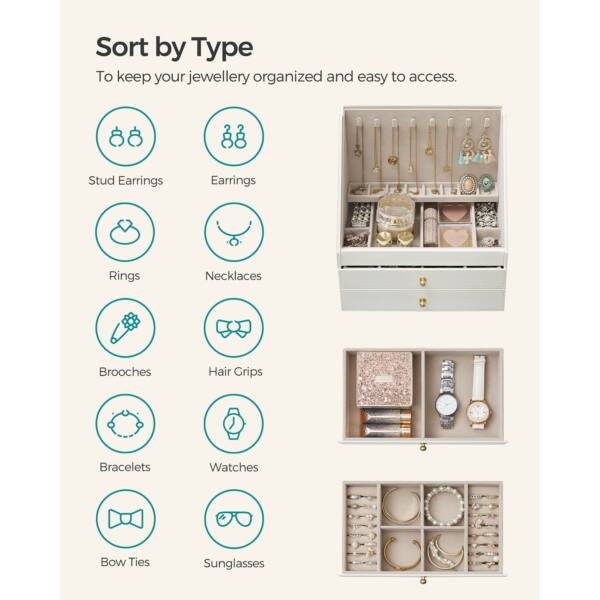 Dėžutė pagaminta iš medžio dulkių plokštė (MDF) (vidutinio tankio medienos plaušų plokštės), PU (poliuretano) ir aksomo, todėl ji yra tvirta ir patvari. Stiklinis viršus leidžia lengvai matyti viduje esančius papuošalus, o papildomi stalčiai suteikia daugiau vietos jūsų kolekcijai.