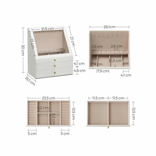 Ši elegantiška papuošalų dėžutė su pasvirusiu stiklu ir papildomais stalčiais yra puikus pasirinkimas jūsų brangenybėms laikyti. Jos debesuota balta spalva suteikia prabangos ir švaros pojūtį, o kokybiškos medžiagos užtikrina ilgaamžiškumą.