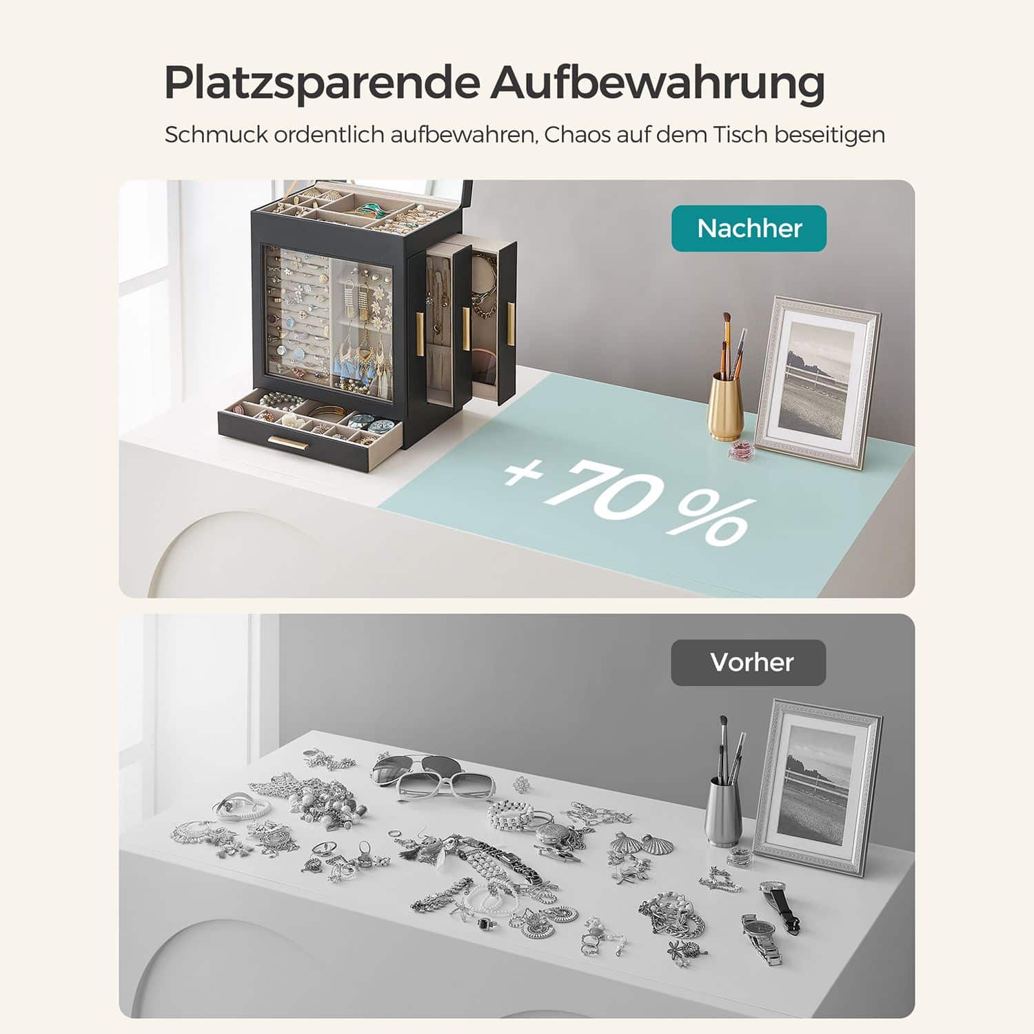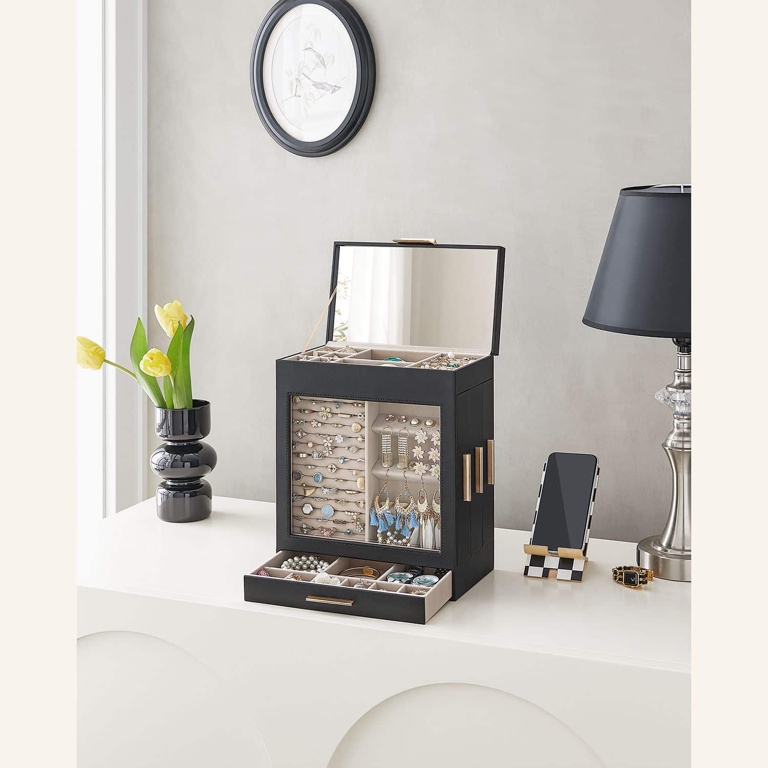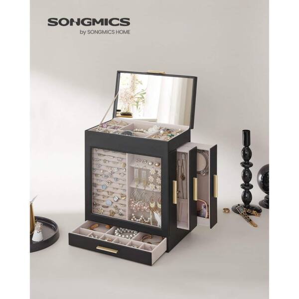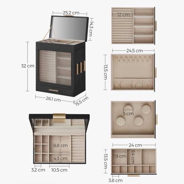 Ši elegantiška papuošalų dėžutė su šoniniais stalčiais ir veidrodžiu yra puikus pasirinkimas jūsų brangenybėms laikyti. Juodos ir auksinės spalvos derinys suteikia prabangos ir stiliaus jūsų interjerui.