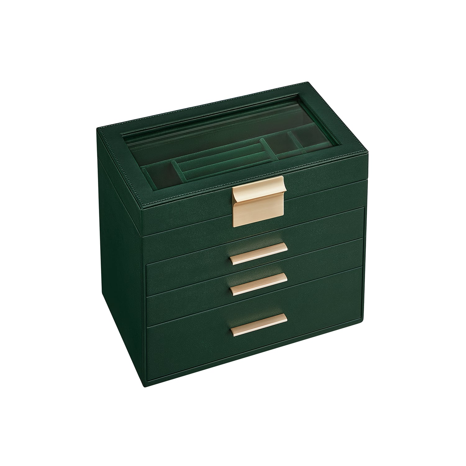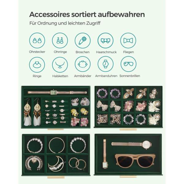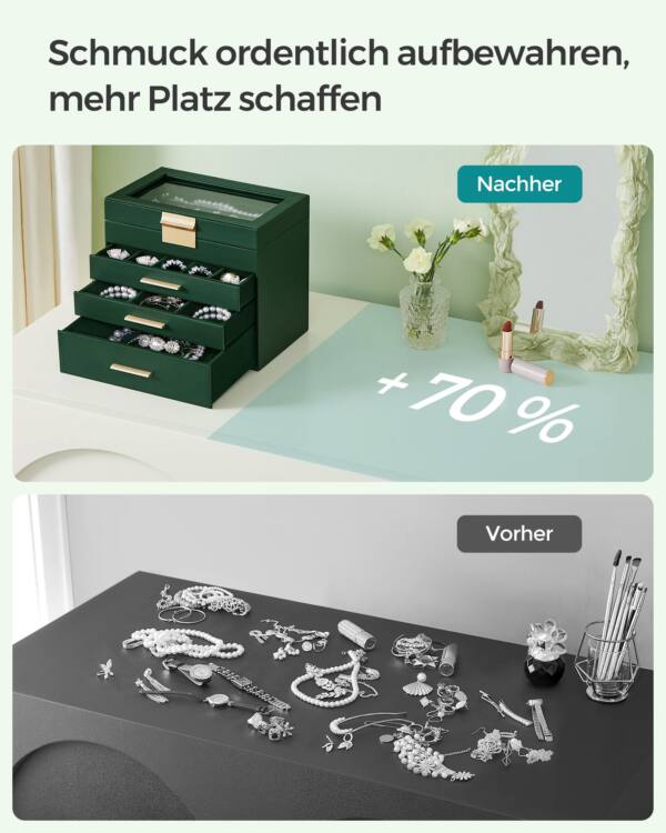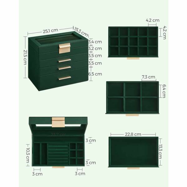 Ši elegantiška papuošalų dėžutė su stalčiais, žalios spalvos, yra puikus pasirinkimas jūsų brangenybėms laikyti. Jos miško žalia-auksinė spalva suteikia prabangos ir išskirtinumo jūsų interjerui.