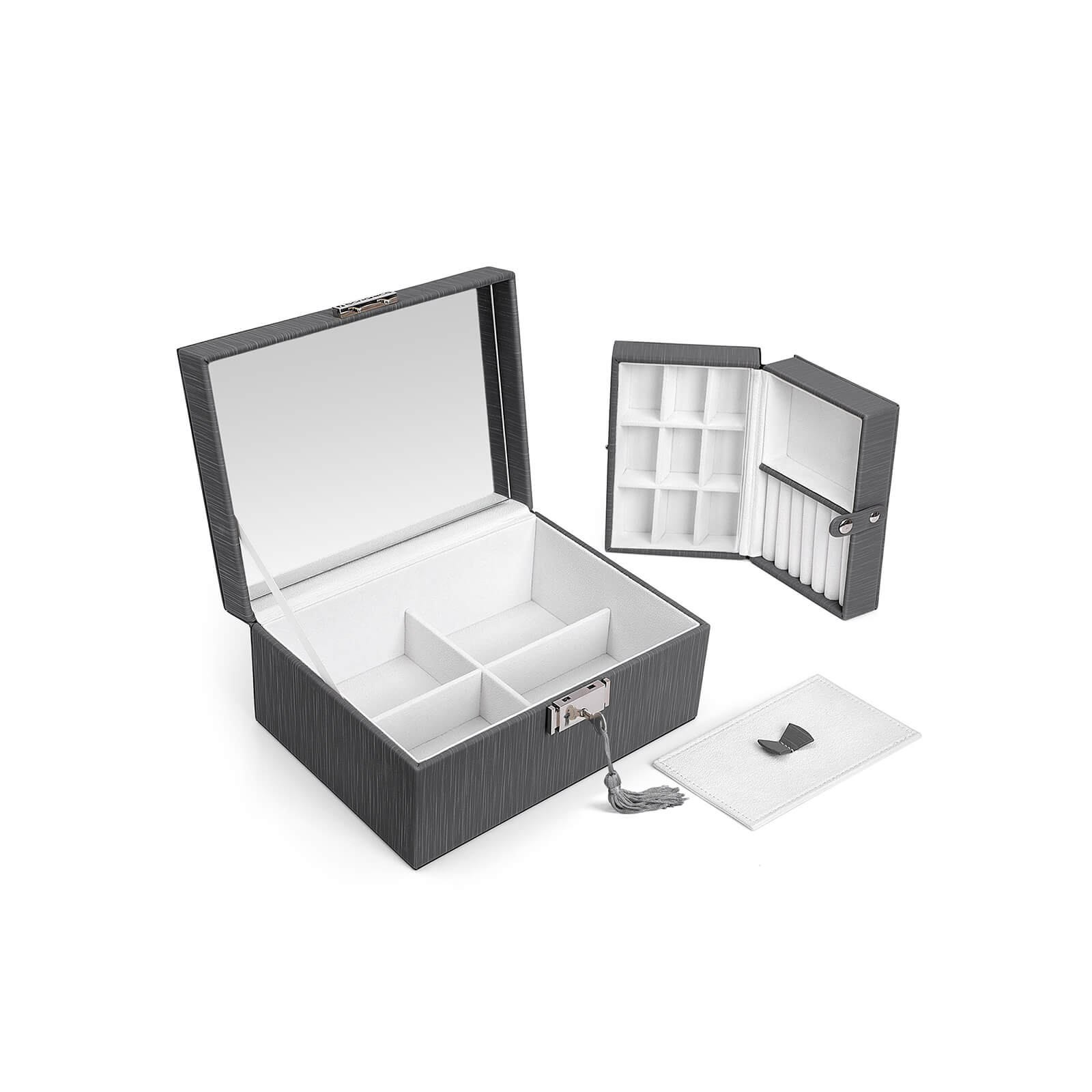 Viduje rasite kelis skyrius, kurie padės tvarkingai laikyti įvairius papuošalus – nuo žiedų ir auskarų iki apyrankių ir grandinėlių. Veidrodinė dangtis leidžia patogiai pasitikrinti savo išvaizdą, o pilka spalva suteikia modernumo ir elegancijos.