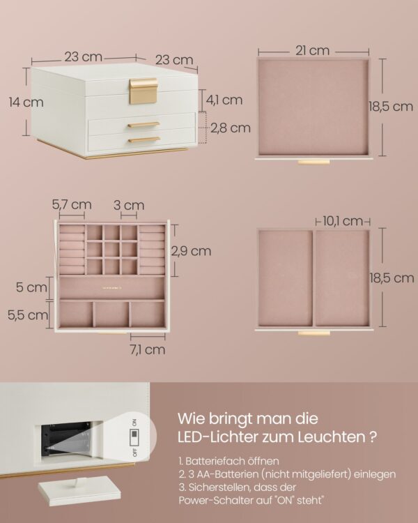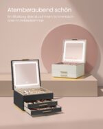 Ši prabangi papuošalų dėžutė su veidrodžiu yra ne tik stilingas aksesuaras, bet ir praktiškas sprendimas jūsų brangenybėms laikyti. Sukurta iš aukštos kokybės medžiagų, ji puikiai dera prie bet kokio interjero ir suteikia jūsų erdvei elegancijos.