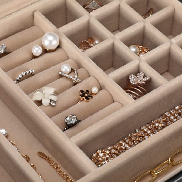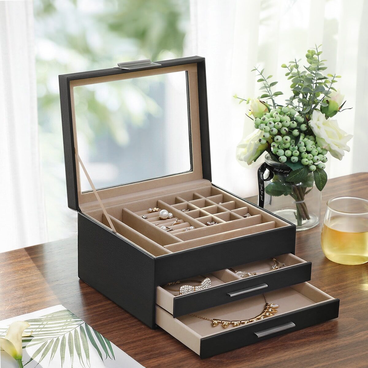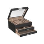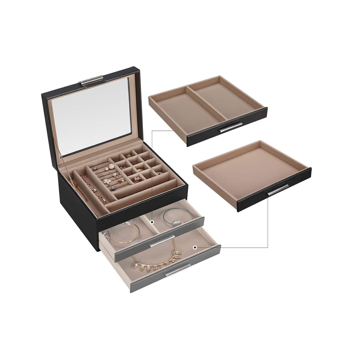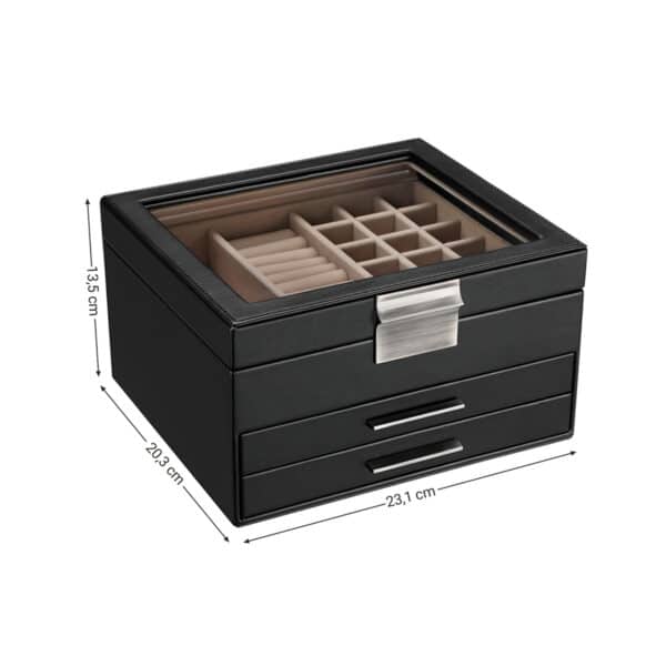 Lengva prieiga prie reikalingų papuošalų. Prieš eidami į darbą ar į pasimatymą, nesikrapštykite netvarkingame stalčiuje, kad surastumėte tinkantį vėrinį. Ši papuošalų dėžutė su stikliniu dangteliu padeda laikyti visus papuošalus vienoje vietoje, tvarkingai ir lengvai pasiekiamoje vietoje. Smulkius daiktus, kuriuos norite apsaugoti nuo smalsių akių, galite sutalpinti dviejuose skirtingo išplanavimo stalčiuose.