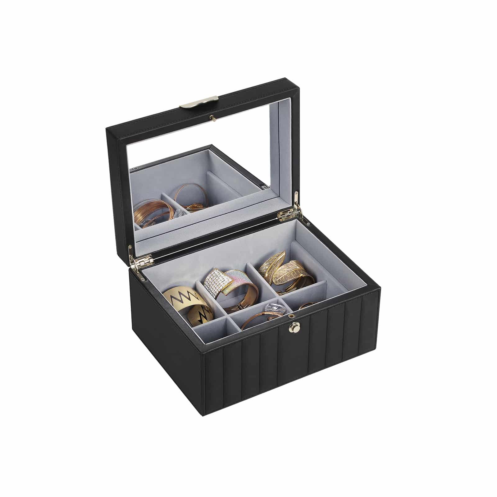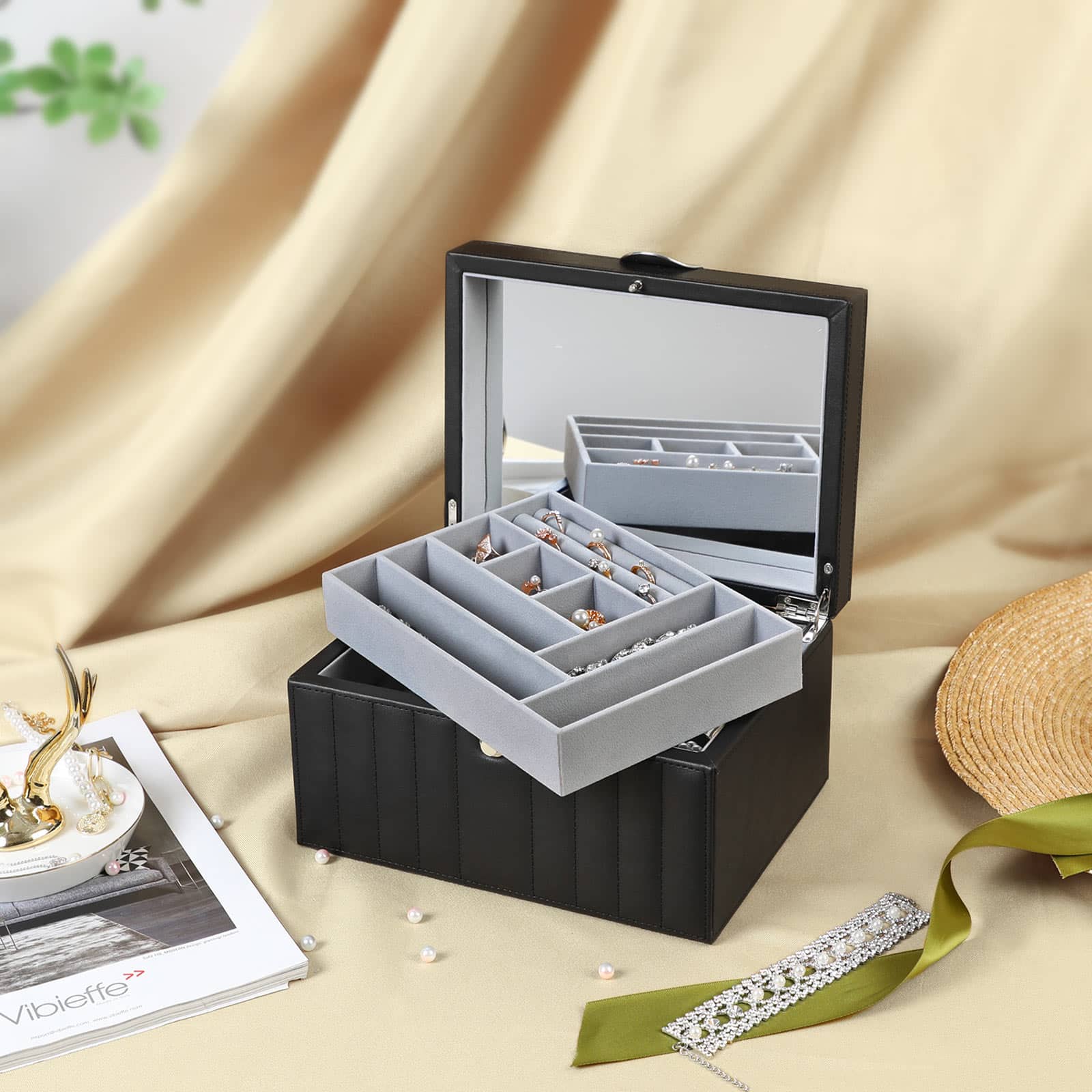 Veidrodis, integruotas į dėžutės dangtį, leidžia patogiai pasitikrinti savo išvaizdą, kai renkatės papuošalus. Tai ypač patogu rytais, kai skubate pasiruošti dienai.
