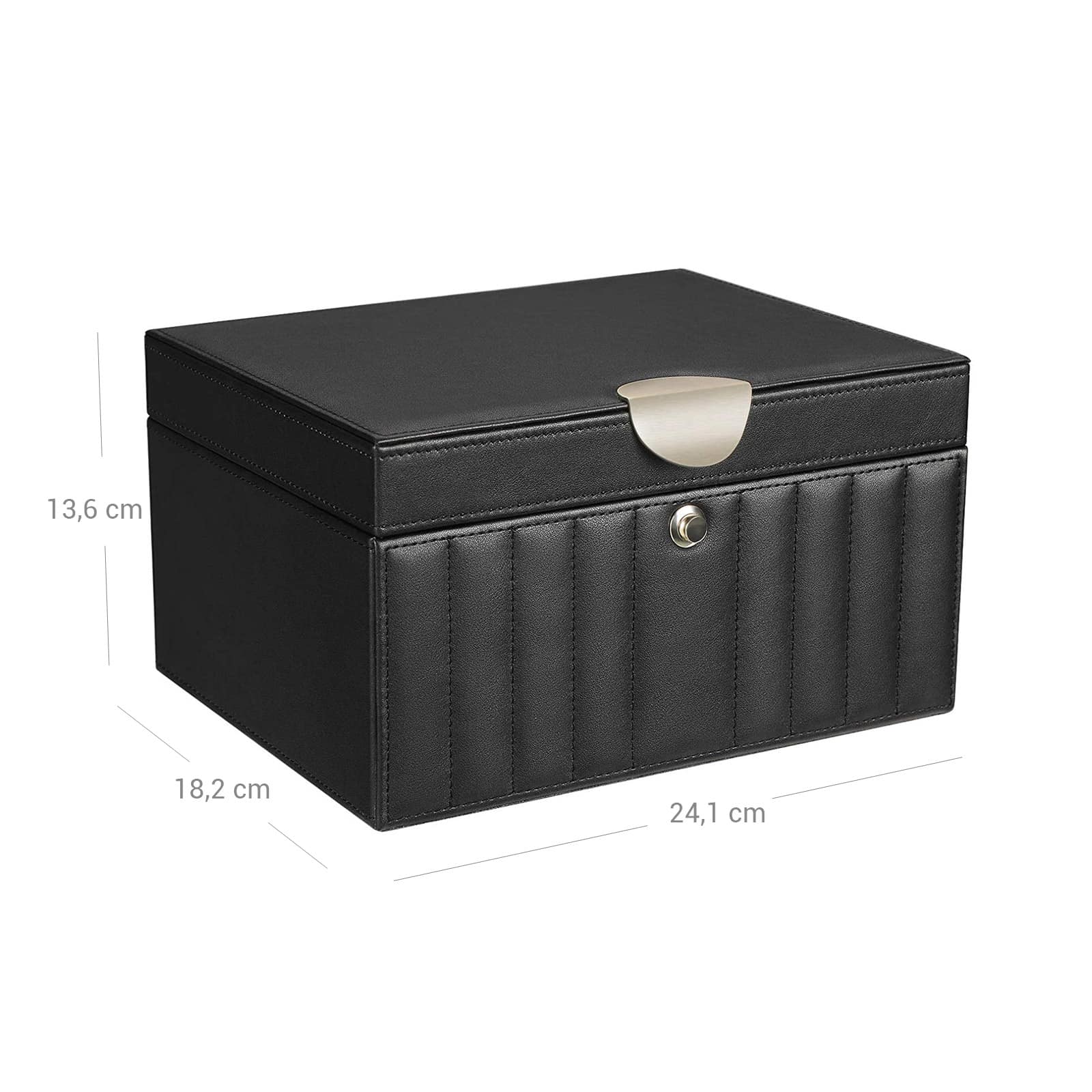 Dėžutė pagaminta iš aukštos kokybės medžiagų, kurios užtikrina ilgaamžiškumą ir patvarumą. Juodos spalvos apdaila suteikia elegancijos ir modernumo, todėl ši papuošalų dėžutė puikiai tiks bet kokiame interjere.