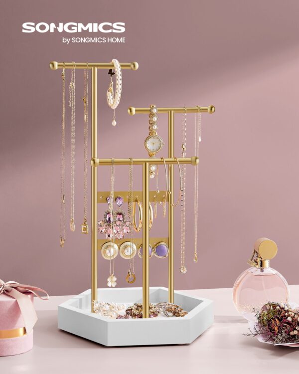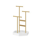 Pristatome Jums išskirtinį papuošalų laikiklį, kuris ne tik padės tvarkingai laikyti Jūsų brangiausius aksesuarus, bet ir taps stilingu interjero akcentu. Šis laikiklis, derinantis baltos ir auksinės spalvų eleganciją, puikiai tiks bet kokiam interjerui, suteikdamas jam prabangos ir rafinuotumo.