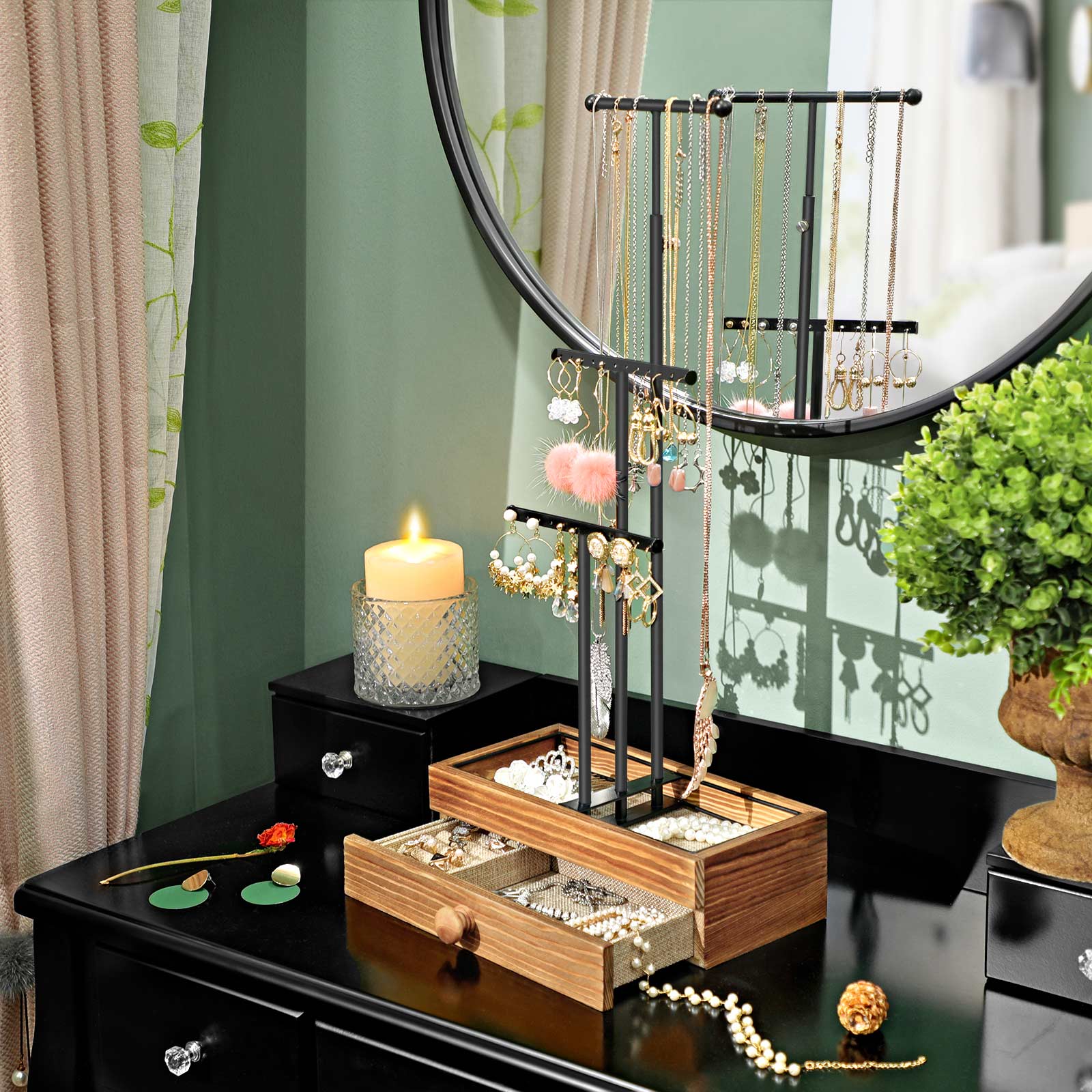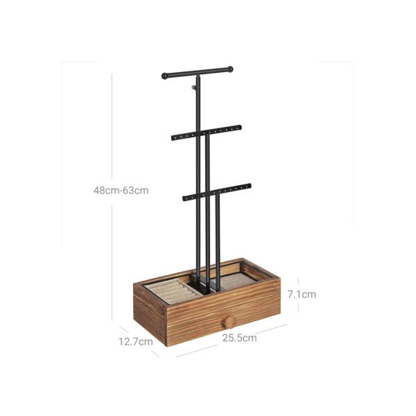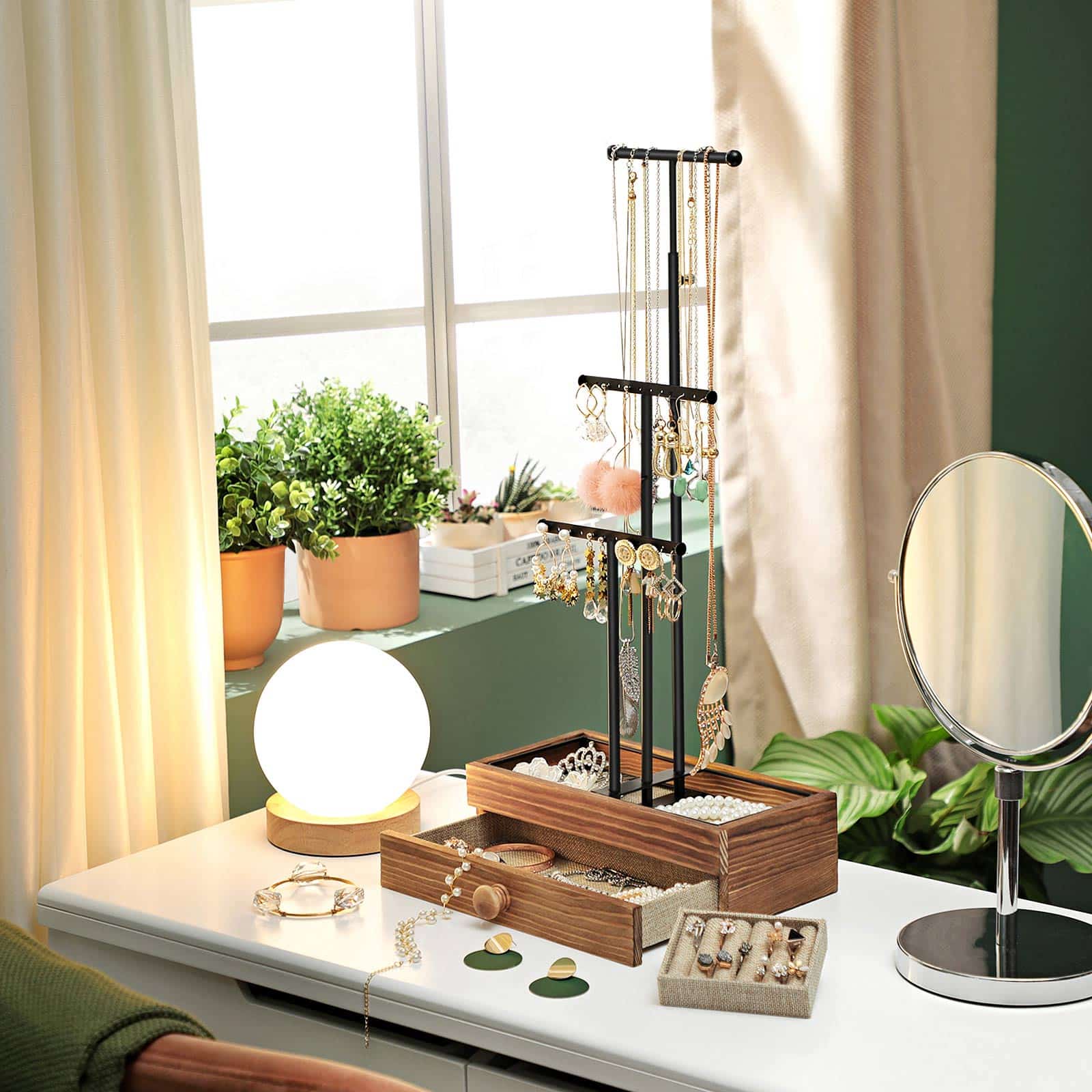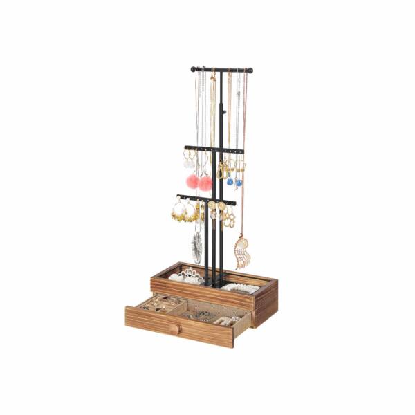 Padėkite savo papuošalus tinkamoje šviesoje: ar jūsų papuošalų kolekcija didėja? Nekraukite žiedų, karolių, apyrankių ir auskarų į vieną stalčių! Šis sumanus juvelyrinių dirbinių stovas „du viename“ siūlo jums daugiau pagalbos nei kiti. Ant grotelių ir mažame stalčiuje laikykite daug vertingų daiktų!
