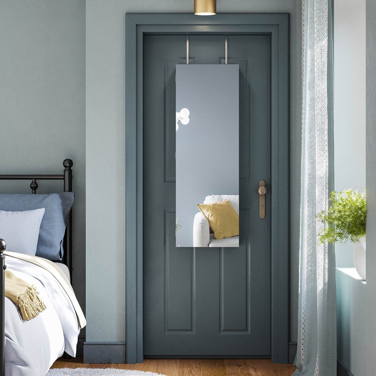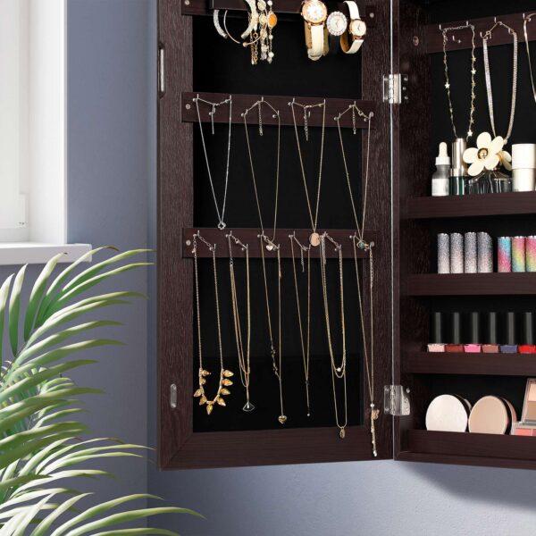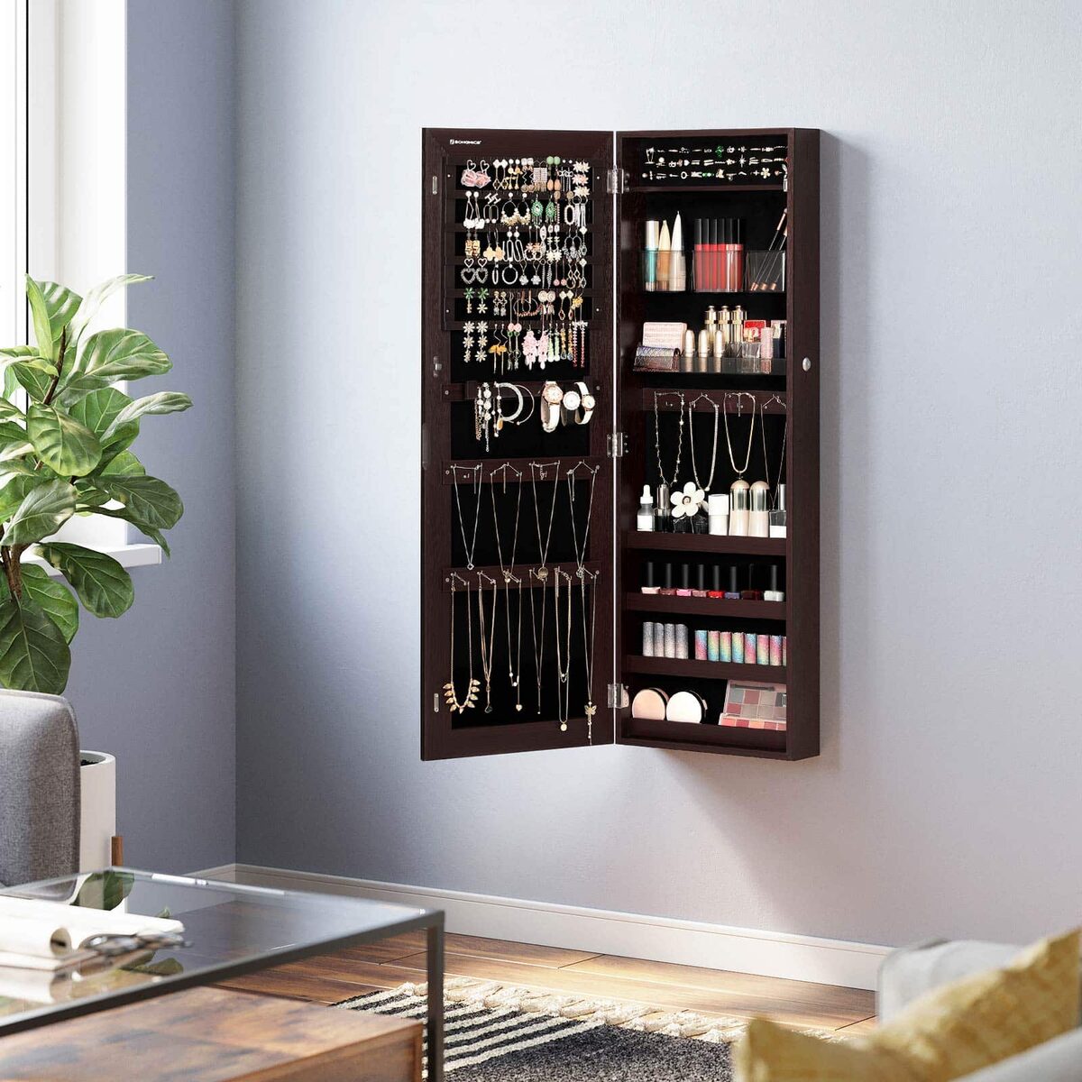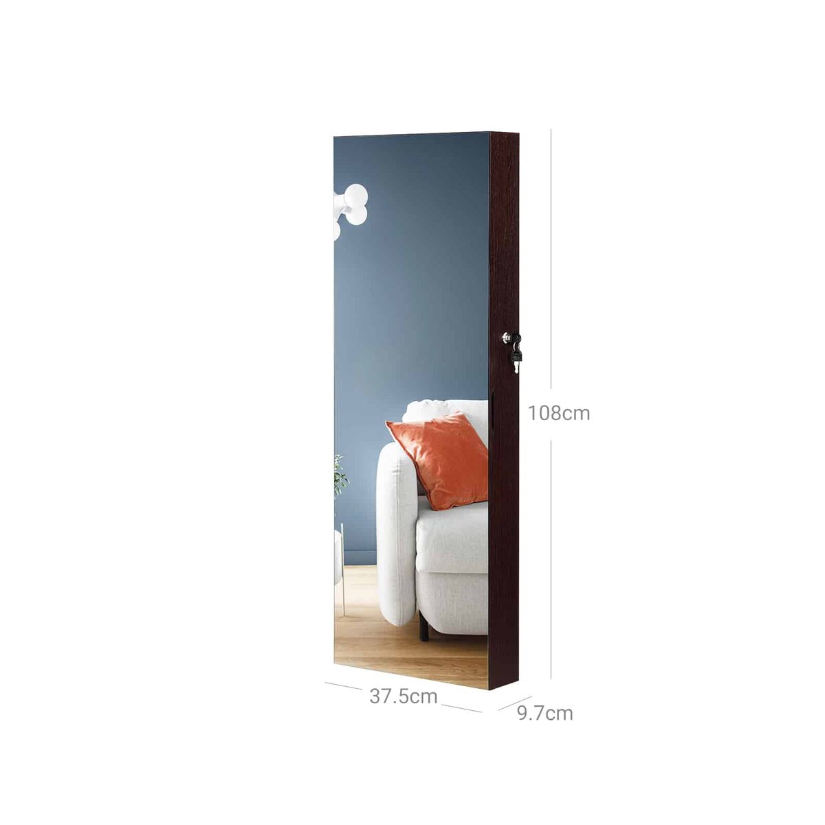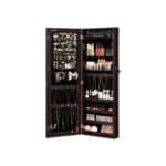 Vieta, kur jūsų papuošalai jaučiasi saugūs. Nepalikite papuošalų ir makiažo pūti tamsiuose stalčiuose! Šioje veidrodinėje spintelėje galite laikyti savo lobius kaip vitrinoje ir apsaugoti juos nuo dulkių ir vagių spyna ir dviem raktais. Perlų karoliai, apyrankės, auskarai ir makiažo reikmenys iš karto jausis kaip namuose šioje įmantrioje papuošalų spintelėje!