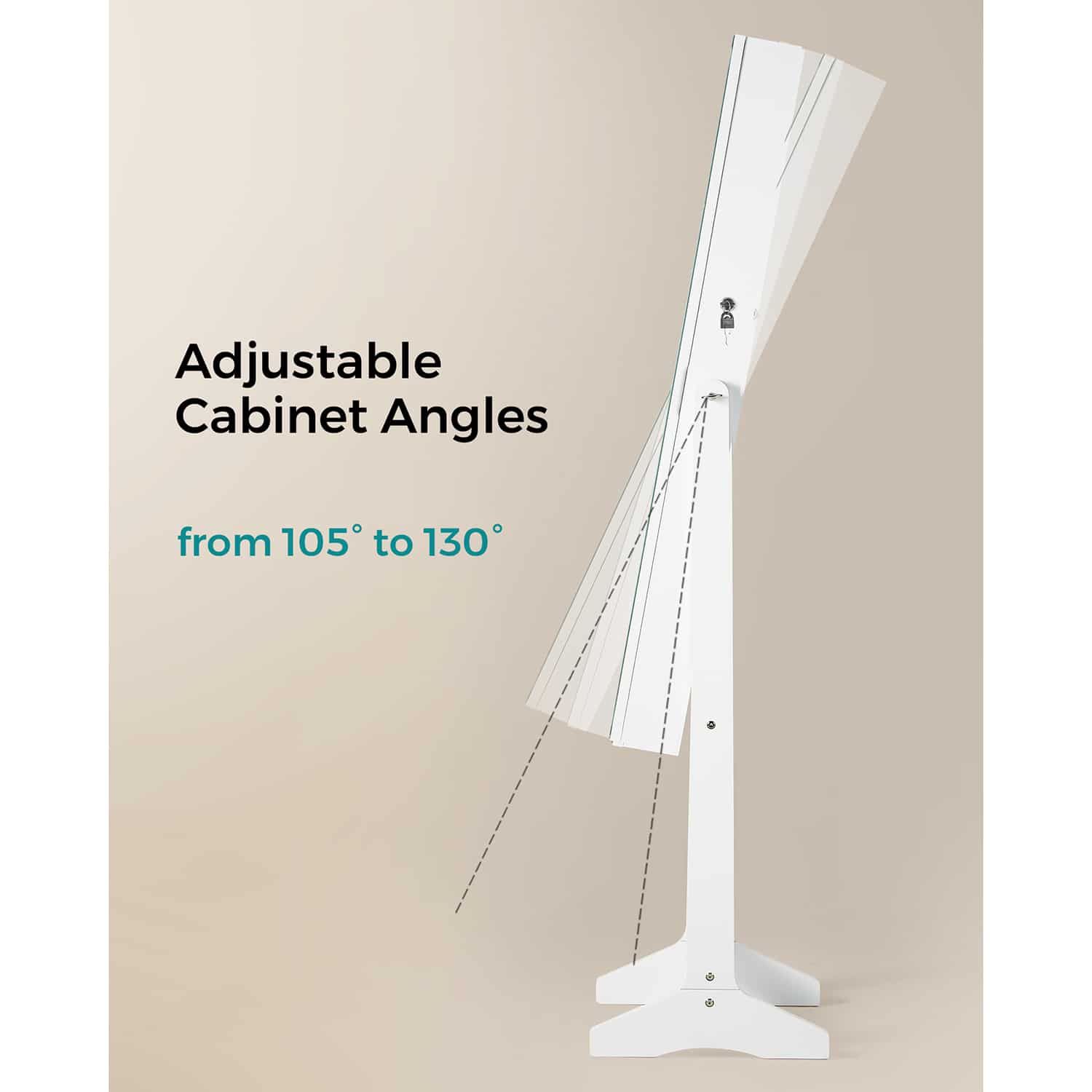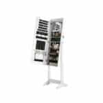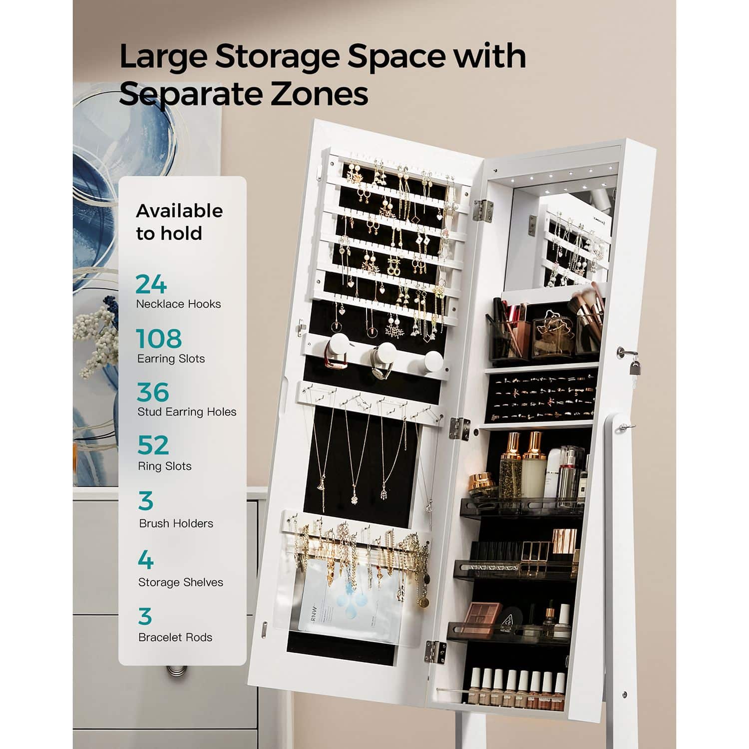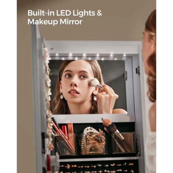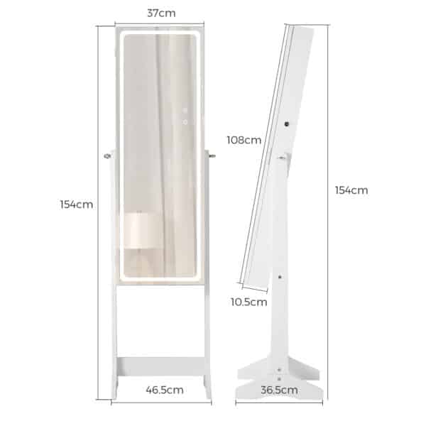 Ši papuošalų spintelė su LED apšvietimu, baltos spalvos, yra puikus pasirinkimas tiems, kurie nori tvarkingai laikyti savo papuošalus ir aksesuarus. Spintelė pagaminta iš aukštos kokybės medžio dulkių plokštė (MDF) (vidutinio tankio medienos plaušų plokštės), stiklo ir aksominio pamušalo, todėl ji yra ne tik funkcionali, bet ir elegantiška.
